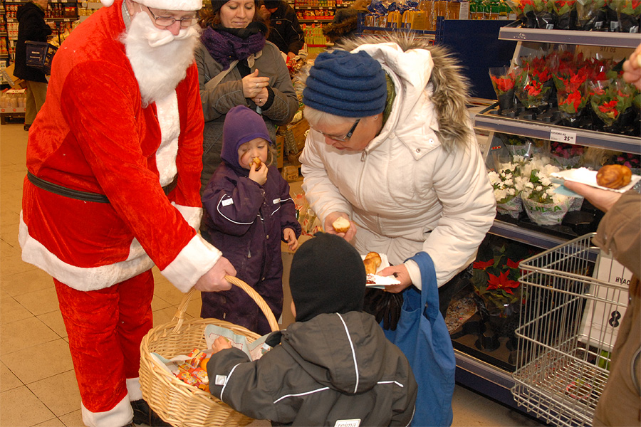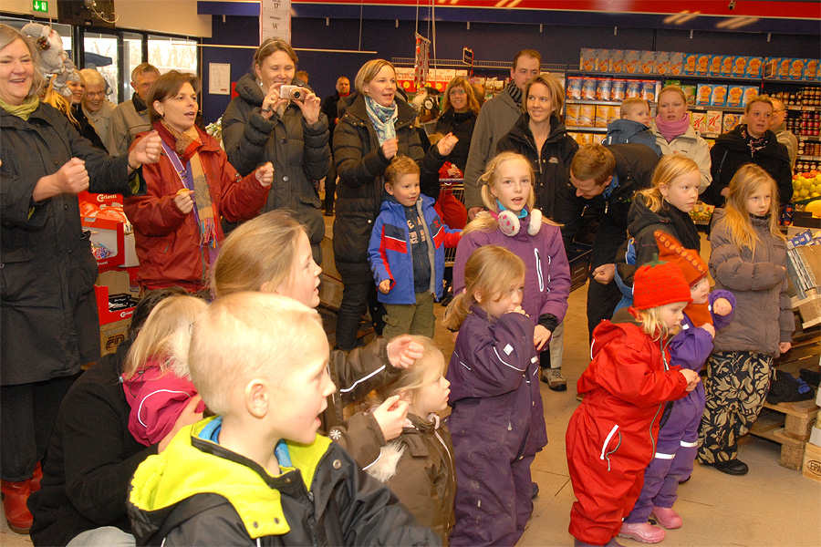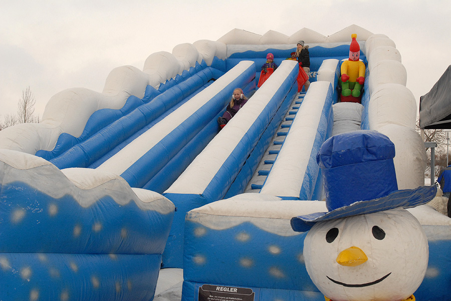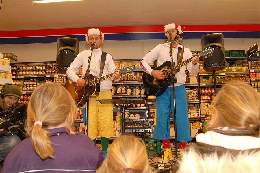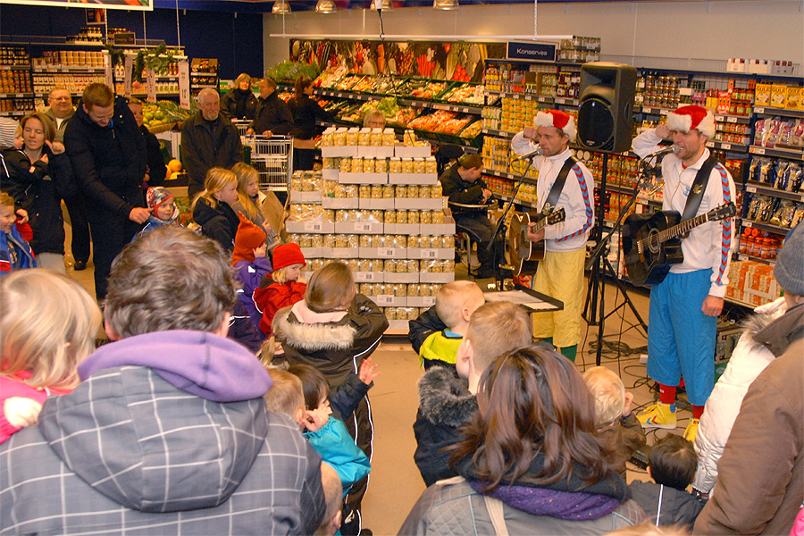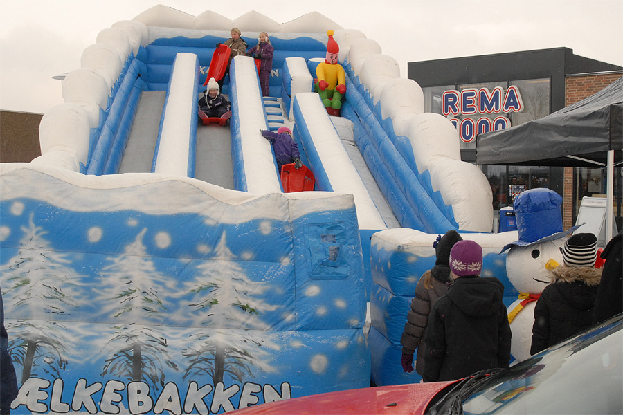 | Alle sejl var sat til i REMA 1000 i Mårslet den sidste søndag før jul. På parkeringspladsen foran forretningen var opsat en stor, luftbåren kælkebakke til morskab og glæde for børnene. Julemanden var ankommet. Han delte gavmildt ud til både børn og voksne, og måtte ind imellem give interview til TV 2 Østjylland. Og med varm glögg og æbleskiver var der godt til både gane og mave. For for den musikalske underholdning stod Kolling og Lillebror med morsomme gags og skøre juleindfald. Og mon ikke mange blev lidt længere i forretningen denne søndag end egentlig planlagt, før juletravlheden og -pligterne igen meldte sig? foto: ©2010 Jørgen Lauritsen