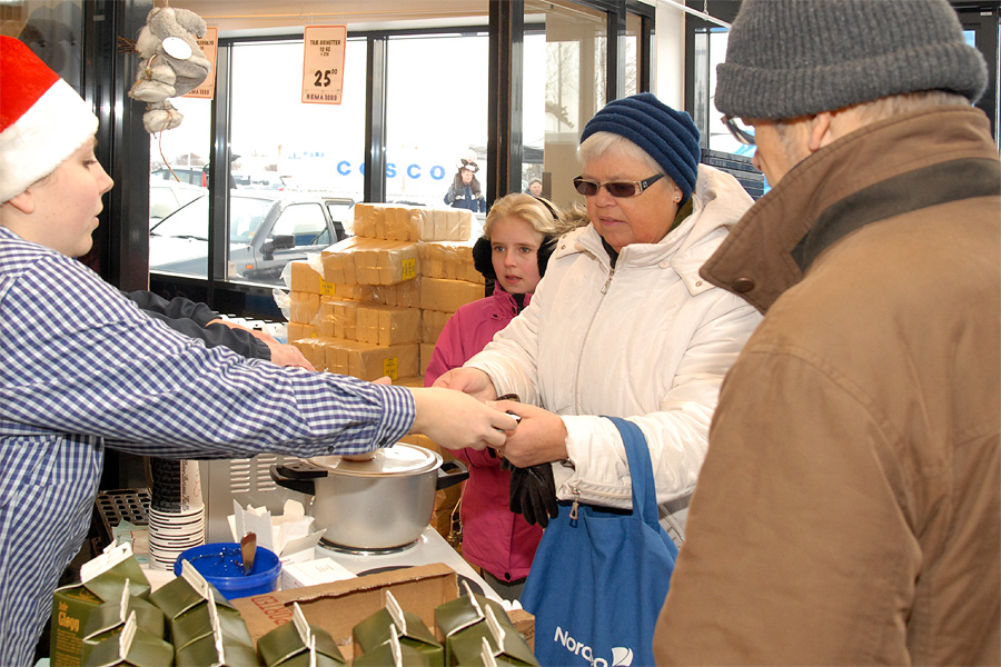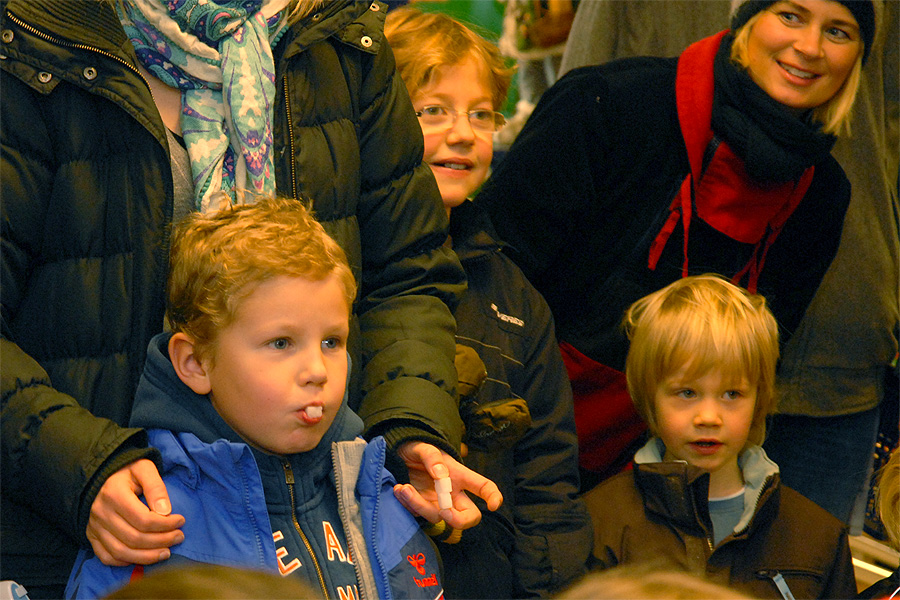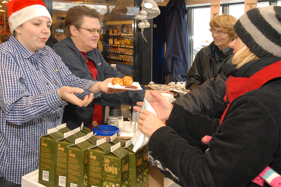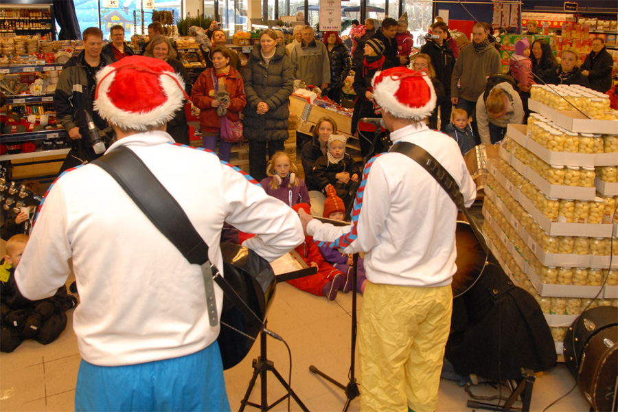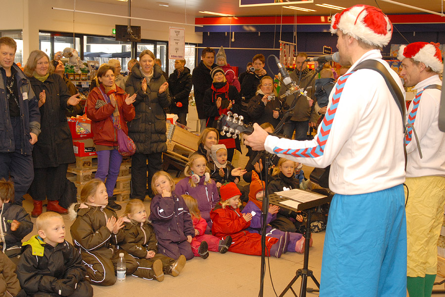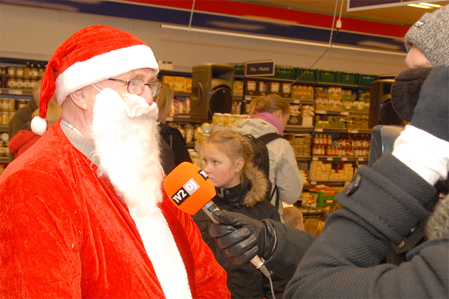 | Alle sejl var sat til i REMA 1000 i Mårslet den sidste søndag før jul. På parkeringspladsen foran forretningen var opsat en stor, luftbåren kælkebakke til morskab og glæde for børnene. Julemanden var ankommet. Han delte gavmildt ud til både børn og voksne, og måtte ind imellem give interview til TV 2 Østjylland. Og med varm glögg og æbleskiver var der godt til både gane og mave. For for den musikalske underholdning stod Kolling og Lillebror med morsomme gags og skøre juleindfald. Og mon ikke mange blev lidt længere i forretningen denne søndag end egentlig planlagt, før juletravlheden og -pligterne igen meldte sig? foto: ©2010 Jørgen Lauritsen