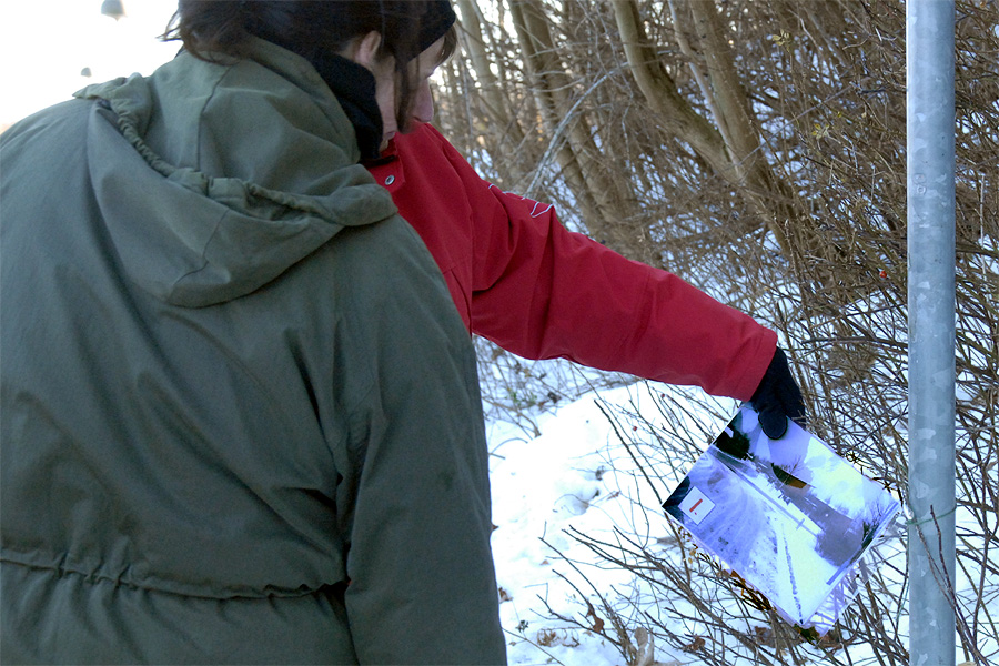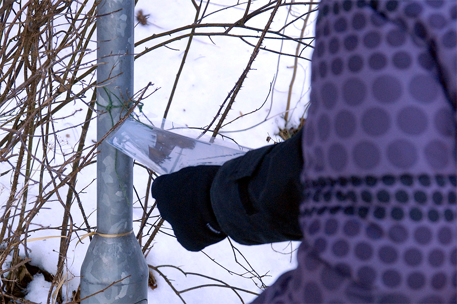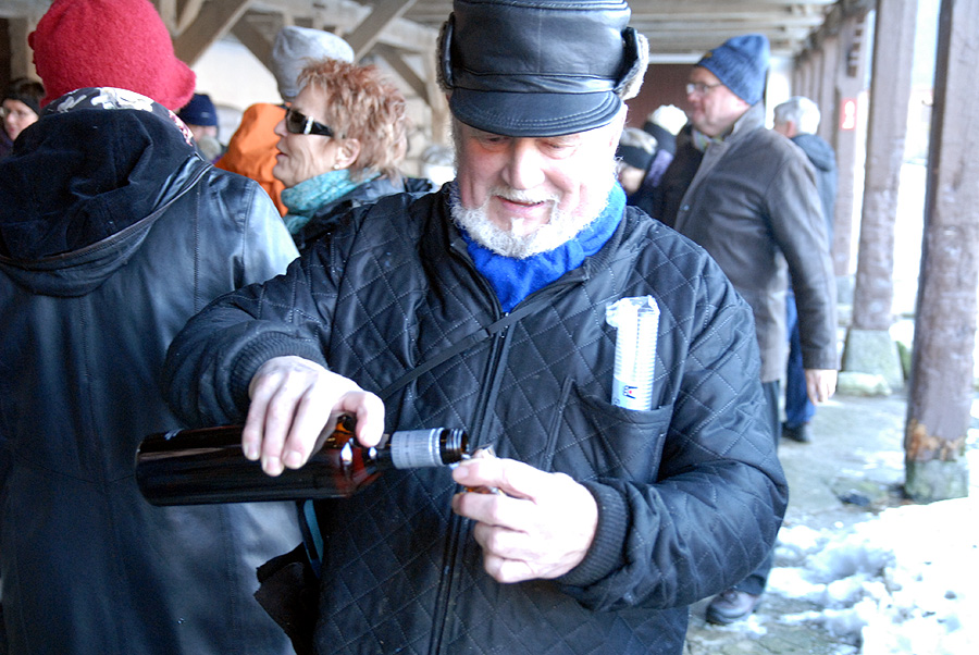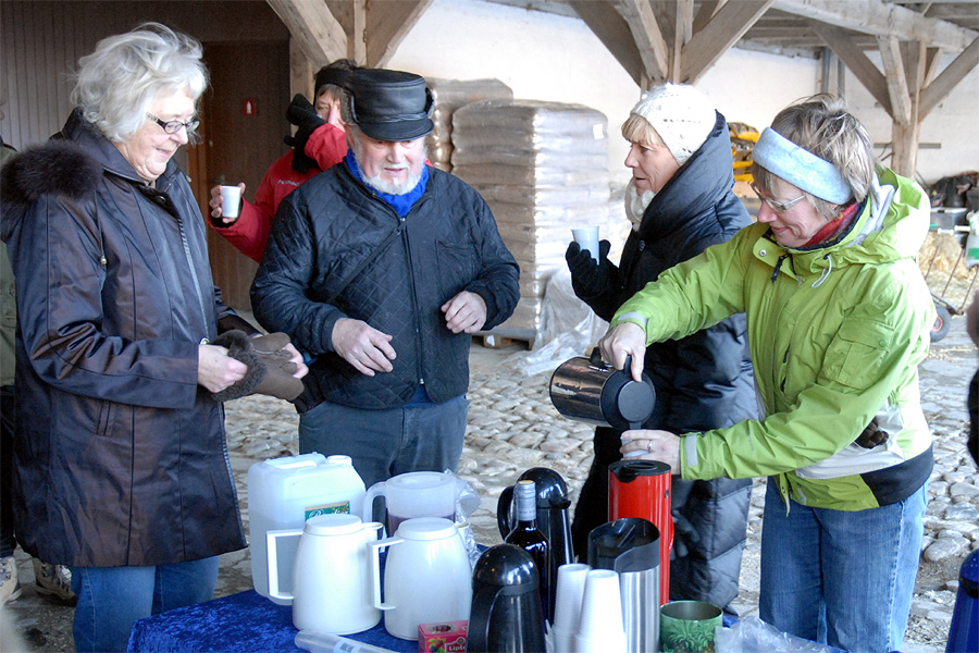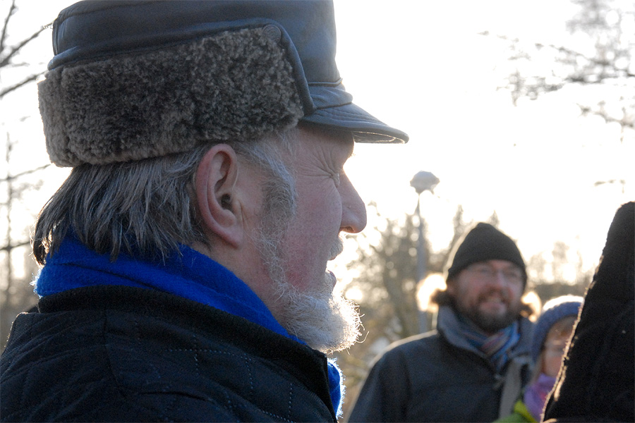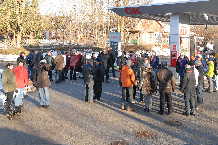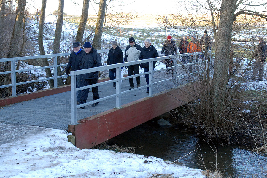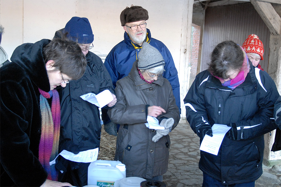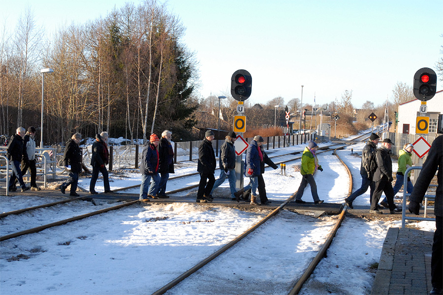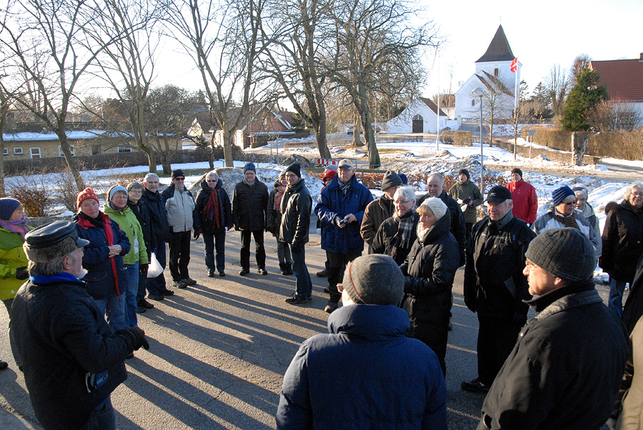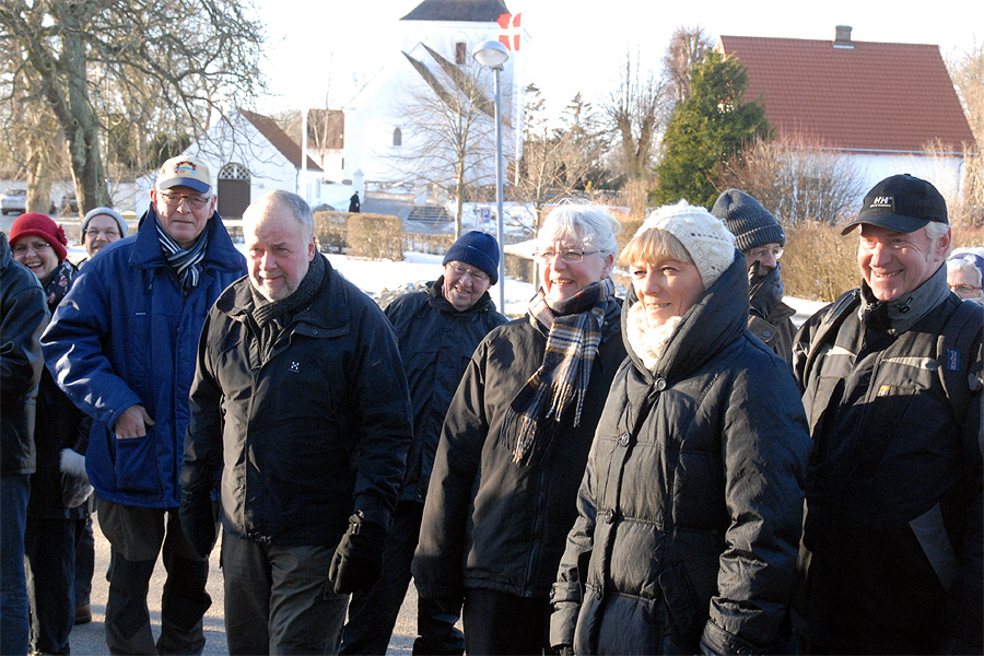 | Omkring et halvthundrede mårslettere havde taget mod Juletræslaugets tilbud om lidt nytårsmotion ved den traditionelle nytårsluntning. Undervejs var indlagt en lille "Kender-du-din-by" konkurrence med karakteristiske mårsletbilleder af Kaj Christensen. Ved mellemstationen på Vilhelmsborg inviterede Juletræslauget på kaffe/the og en lille en til at varme sig på, før turen gik ad Langballevej tilbage til Mårslet. foto: ©2011 Jørgen Lauritsen