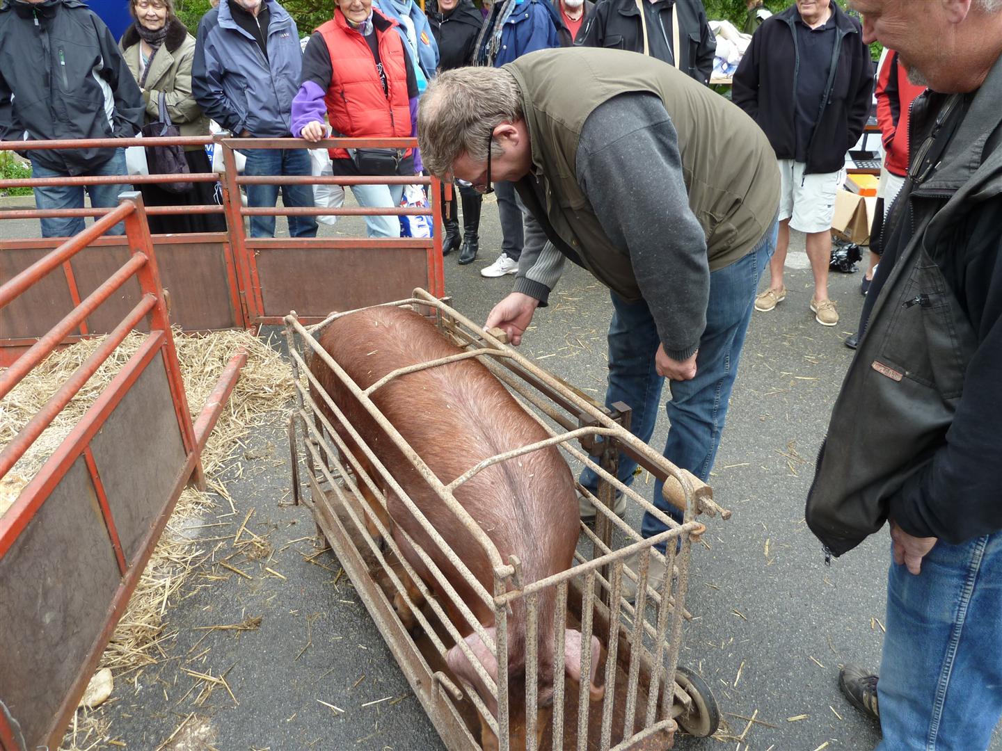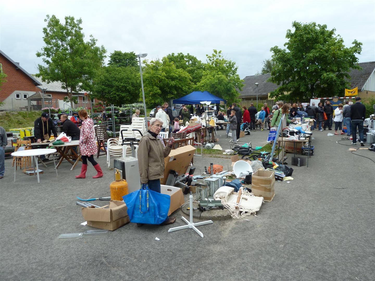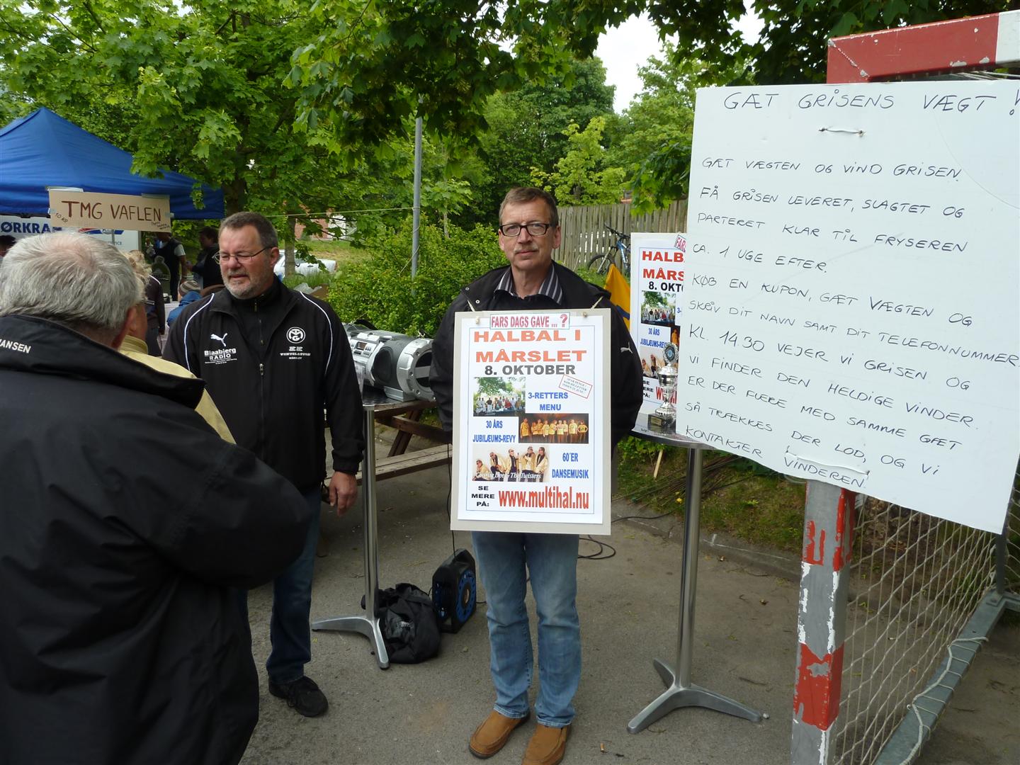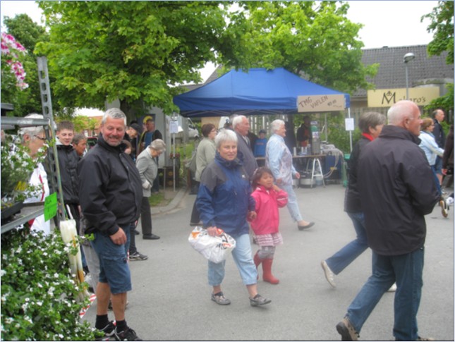 | MAN TAGER FØLGENDE INGREDIENSER: * Masser af godt humør. * Lopper fra borgene i 8320 området. * En lade til opbevaring af lopper. * Masser af glade købere en lørdag. * 30 indsamlere en tirsdag aften fra kl. 18 til 22. ' 30 morgenfriske folk lørdag morgen kl. 5 til at flytte lopper. * En gård til morgenmadsspisning. * 40 gode sælgere lørdag fra kl. 10 til 15. * 15 til at rydde op og læsse ikke solgte lopper på biler og i containere. * En knivspids levende gris. * Sommerblomster med rund hånd. * 8 biler og traktorer. * En del strøm. * 8 gule skilte og 10 plakater rundt i byen. * 60 rundstykker, 40 kebab og 6 pizza + diverse væske. * 50 kg. Grillpølser. * 300 vafler. * 5 fustager øl samt en stænk sodavand eller vand. + diverse andre ingredienser som bare skal være der. * Støtte og sponsering fra de lokale handlende. * 10 trætte optællere af penge. Det hele blandes sammen på byens P-plads og så skal der bages i 5 timer, gerne ved 15 20 grader og helst tørvejr. Pas på! det kan brænde på, især trafikken i midtbyen. Når kages skal laves skal man tage højde for at det kræver en KÆMPE indsats og masser af hårdt arbejde og glade folk - med det er arbejdet værd. RESULTAT: EN DEJLIG KAGE TIL TMG HÅNDBOLD PÅ ca 55.000 KR TAK til alle for stort og småt. Hilsen Jacob, Mads og Flemming Grisen vejede 98 kg. foto: ©2011 Niels Jesper Andersen
