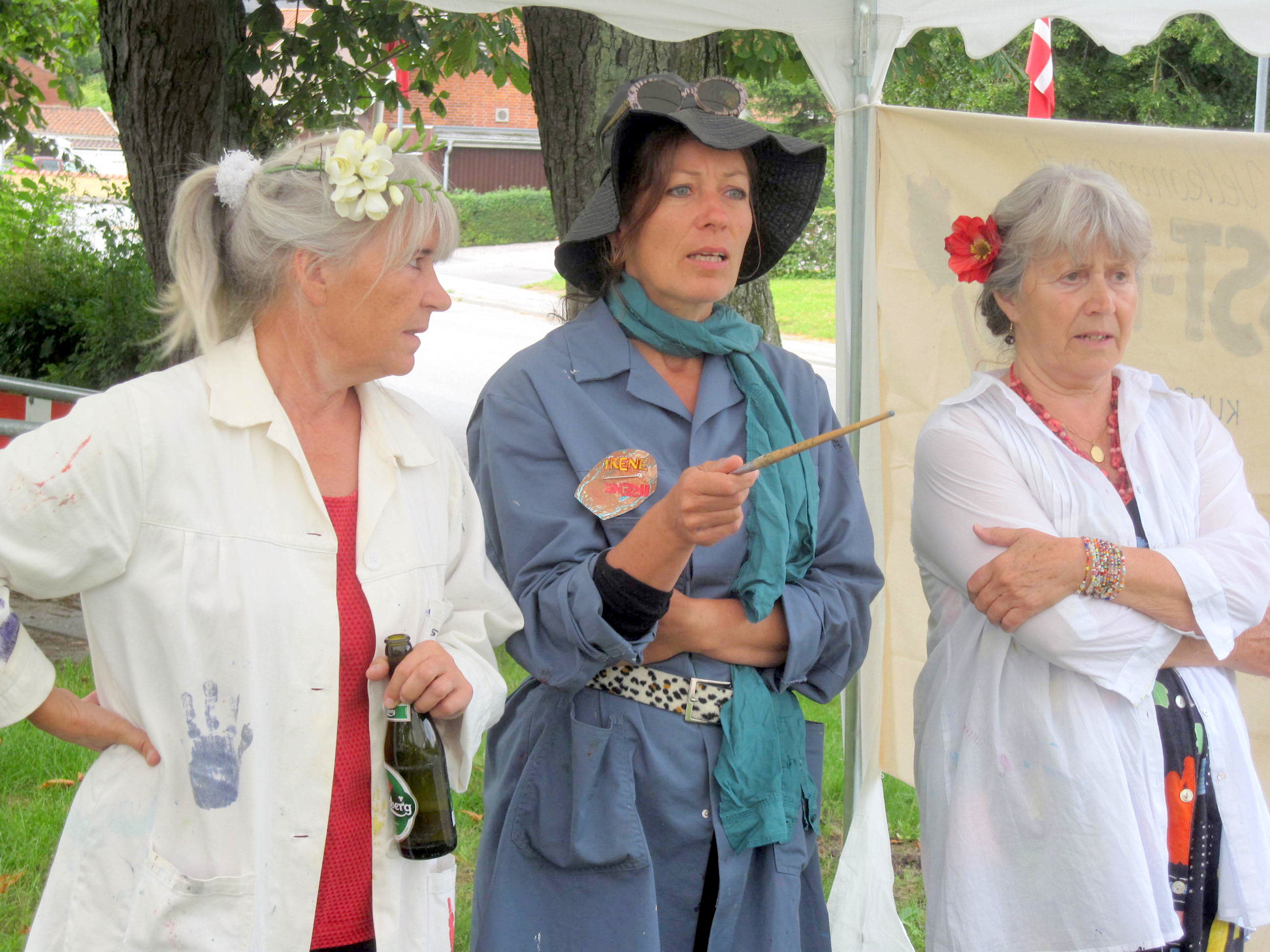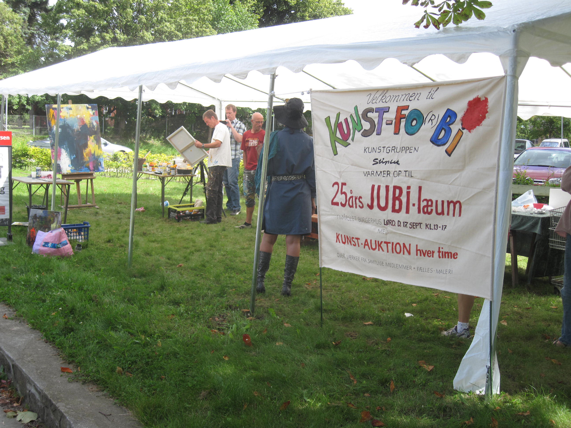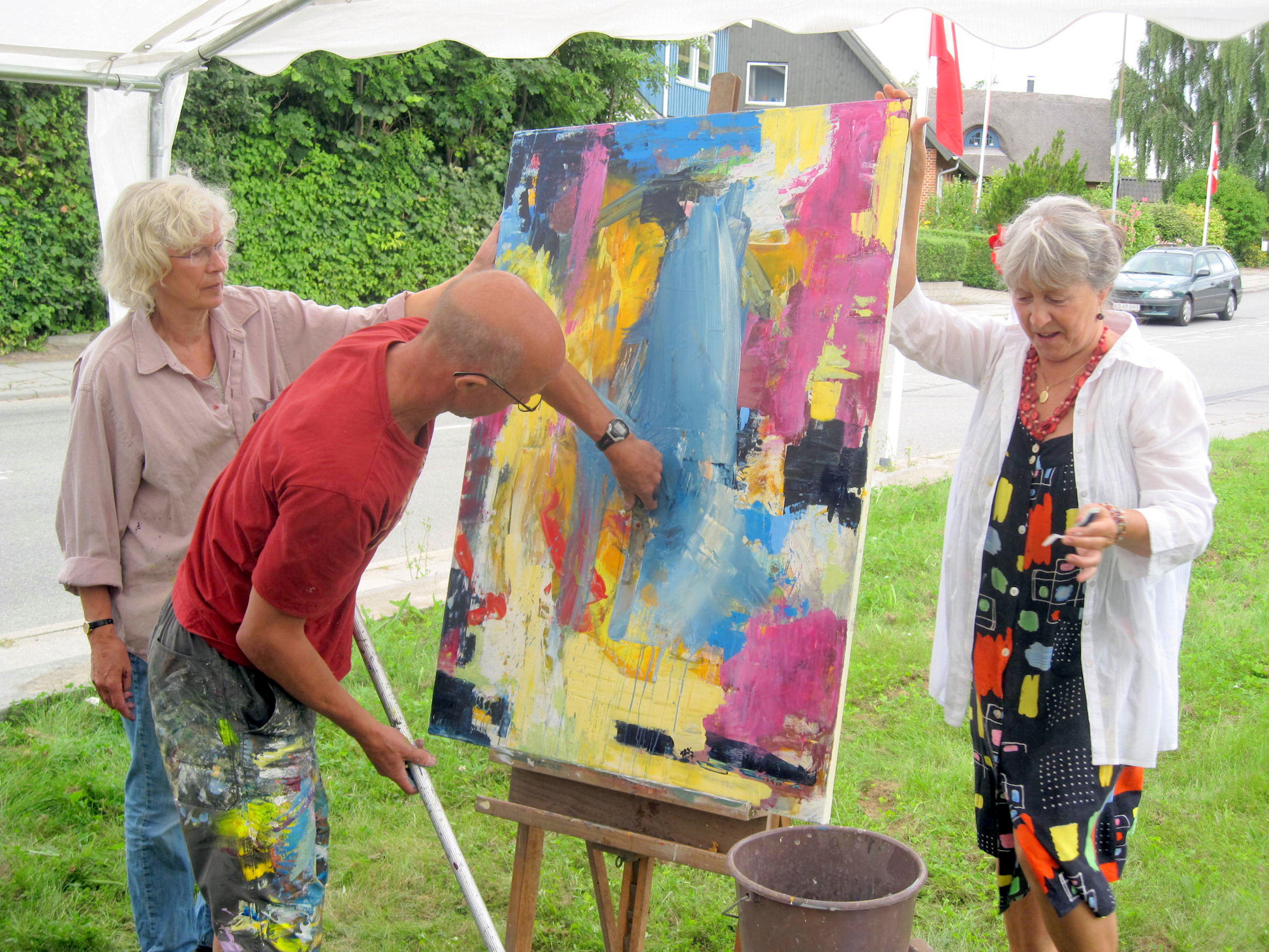 | Under det hvide telt foran OK-tanken, malede medlemmer af kunstgruppen Stiplet et par fællesbilleder, der skal på auktion den 17. september, når Stiplet fejrer deres 25 års jubilæum. Jubilæet markeres med en fødselsdagsreception i Mårslet Borgerhus, netop den 17. september. /KC foto: ©2011 Kurt Petersen