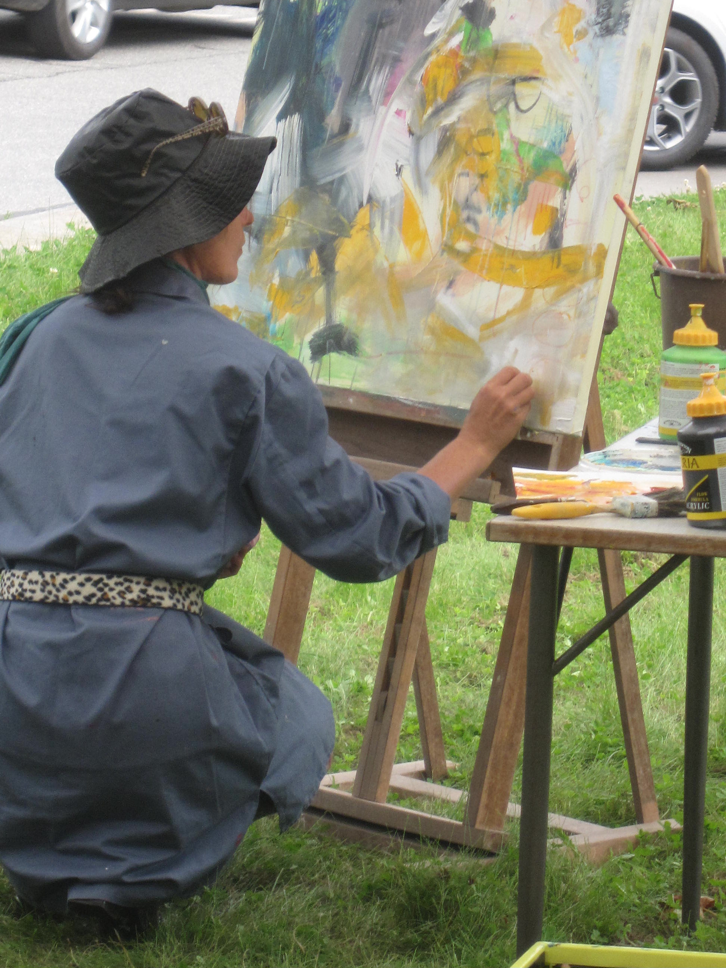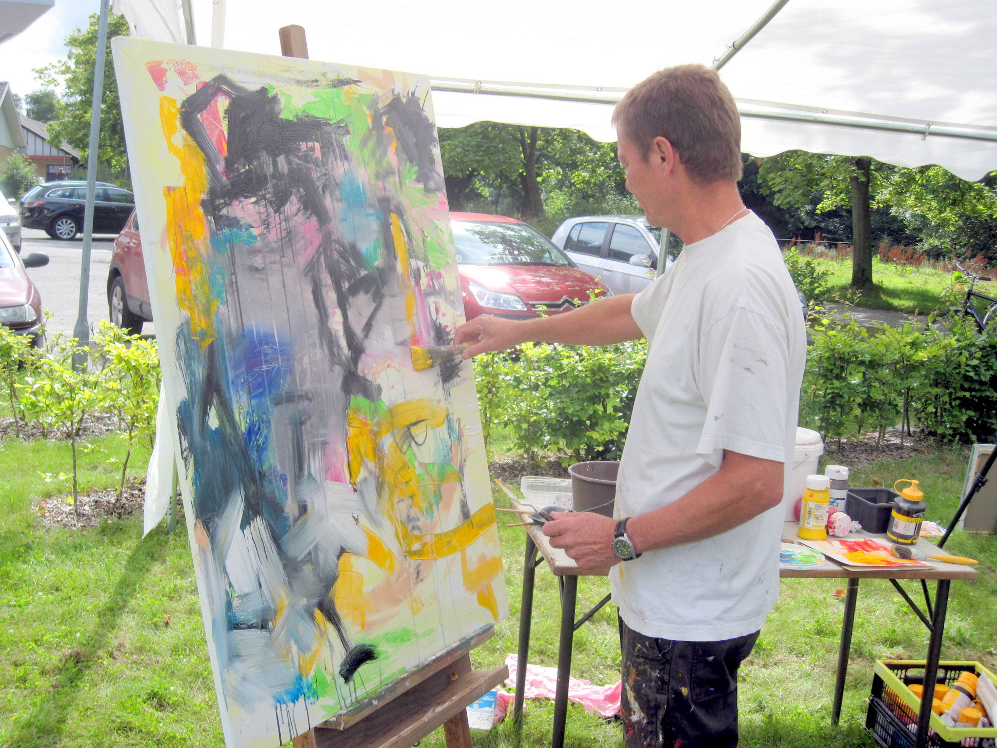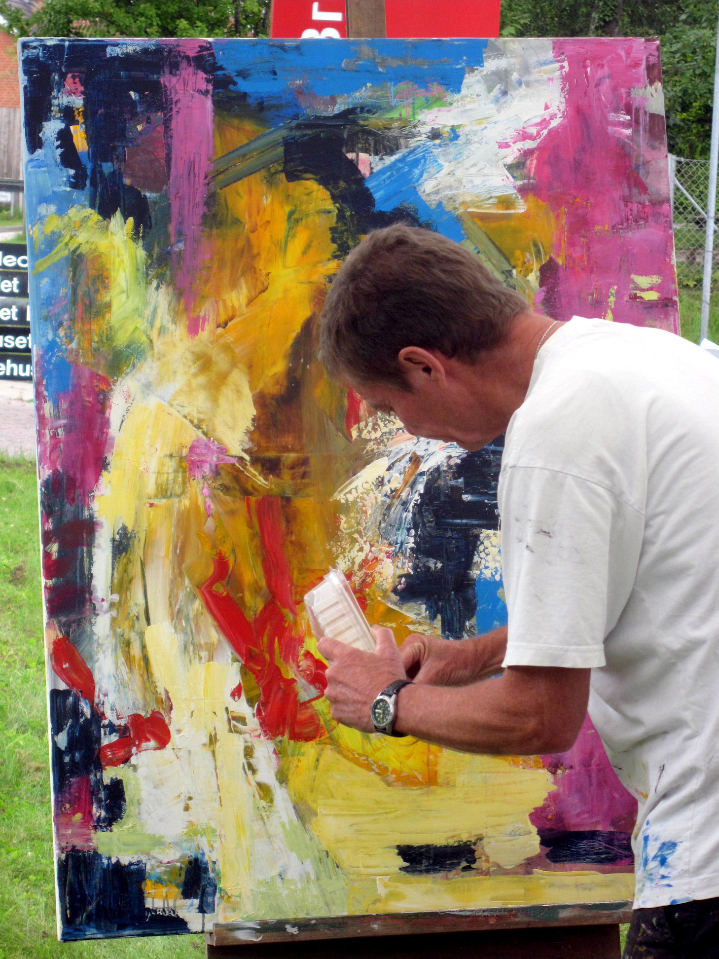 | Under det hvide telt foran OK-tanken, malede medlemmer af kunstgruppen Stiplet et par fællesbilleder, der skal på auktion den 17. september, når Stiplet fejrer deres 25 års jubilæum. Jubilæet markeres med en fødselsdagsreception i Mårslet Borgerhus, netop den 17. september. /KC foto: ©2011 Kurt Petersen