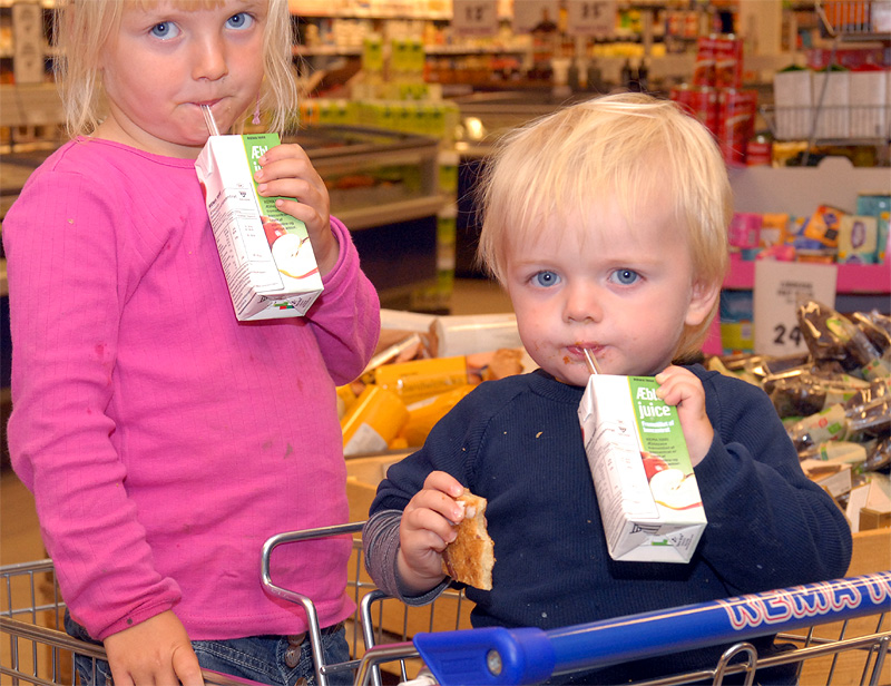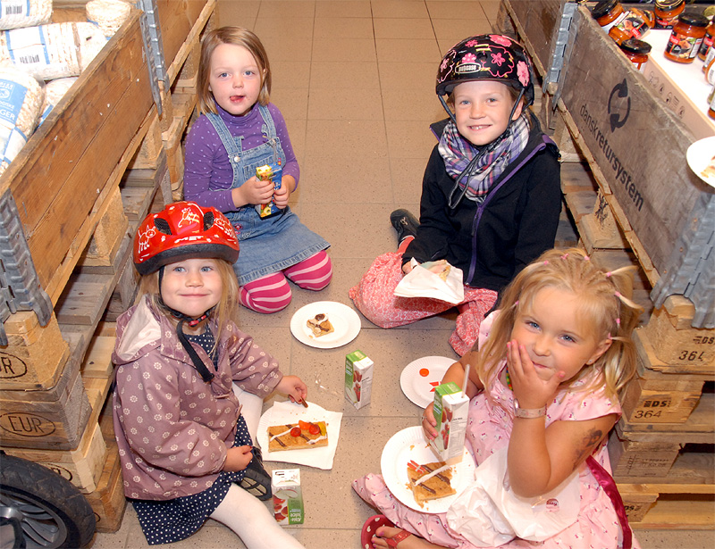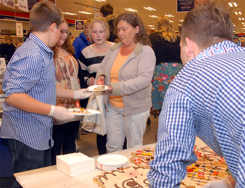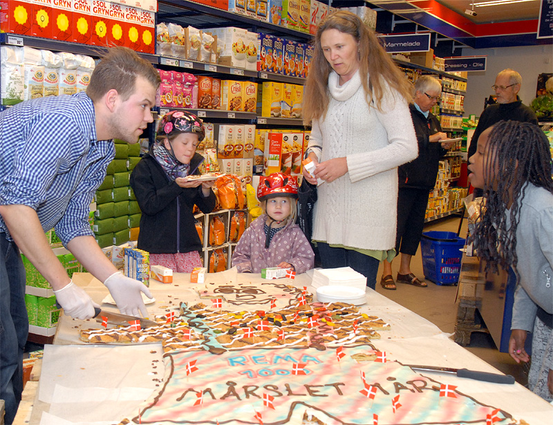| Kunder, der kom til REMA 1000 efter kl 16 den 2. september, blev ved indgangen mødt af Christian og Morten, der gavmildt delte kagemand og juice ud til alle. Anledningen var, at det i dag er nøjagtig 1 år siden REMA 1000 slog dørene op for første gang. Kagemanden, der var i noget nær fuld størrelse, var fremstillet til lejligheden af mårsletbager Makaro's. foto: ©Jørgen Lauritsen