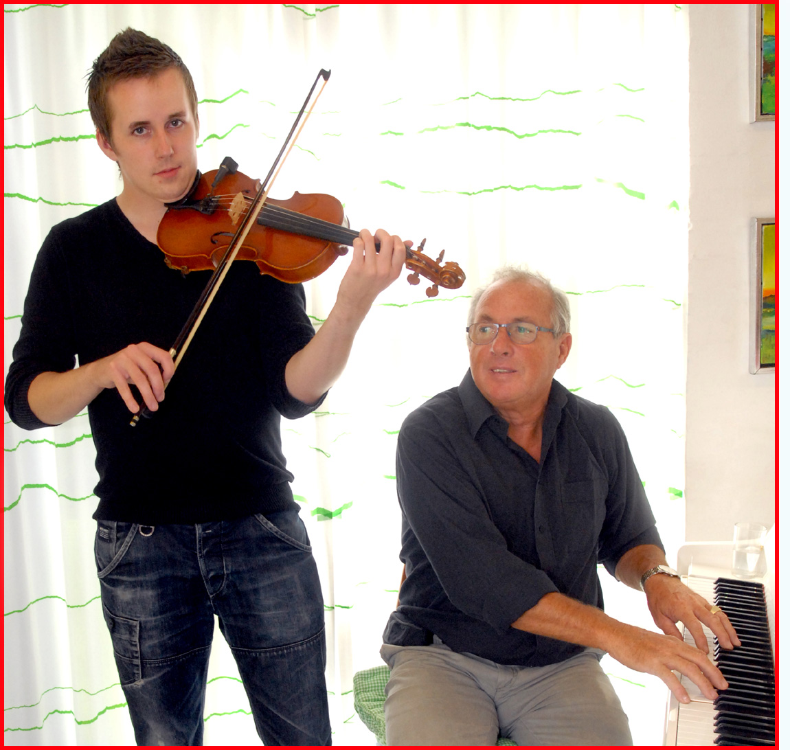 Pianist Ivar Sørensen og den unge violinist Emil Valentin Sørensen er erfarne musikere. Emil har spillet violin siden han var 4 år og mestrer, som sin far Ivar, alverdens stilarter, fra sigøjner-musik over svenske viser til jazz, bossanova og danske sange. Far og søn har i flere år dannet duo til mange festlige lejligheder, hvor de også spiller den næsten glemte salonmusik. De demonstrerede på denne regnfulde eftermiddag, at den gode musik kan tale til folk i alle aldre. Foto: Jørgen Lauritsen ©2011 | |||