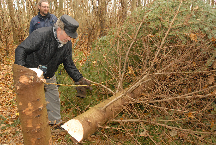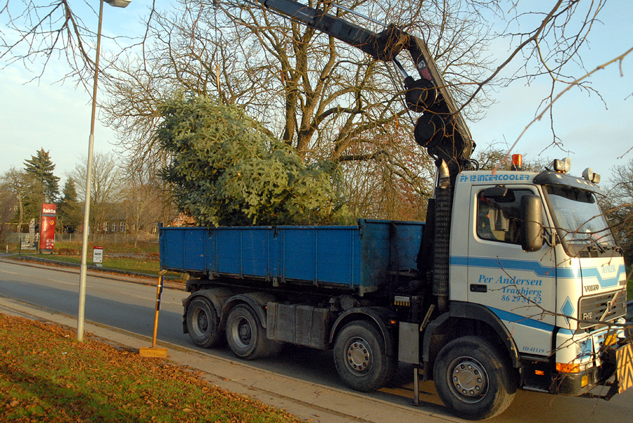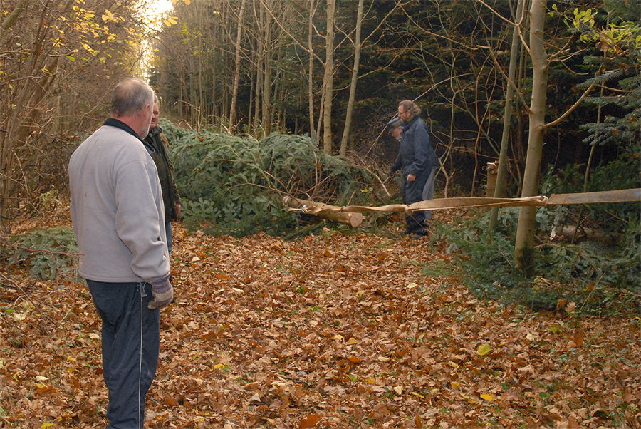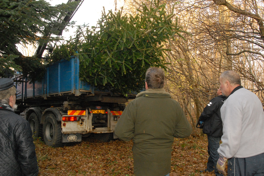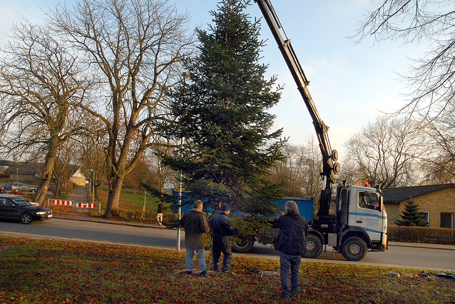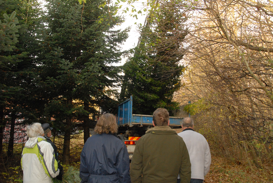 | Et af de helt faste tegn på at julen nærmer sig er, når Mårslet Juletræslaug sammen med vognmand Per Andersen drager i skoven for at hente byens juletræ. Det fandt i år sted søndag den 20. november på en dag, der føltes helt forårsagtig. I ugens løb bliver det så forsynet med lys, så alt er klar til den traditionelle tænding lørdag den 26. november kl. 16:00. foto: ©Jørgen Lauritsen