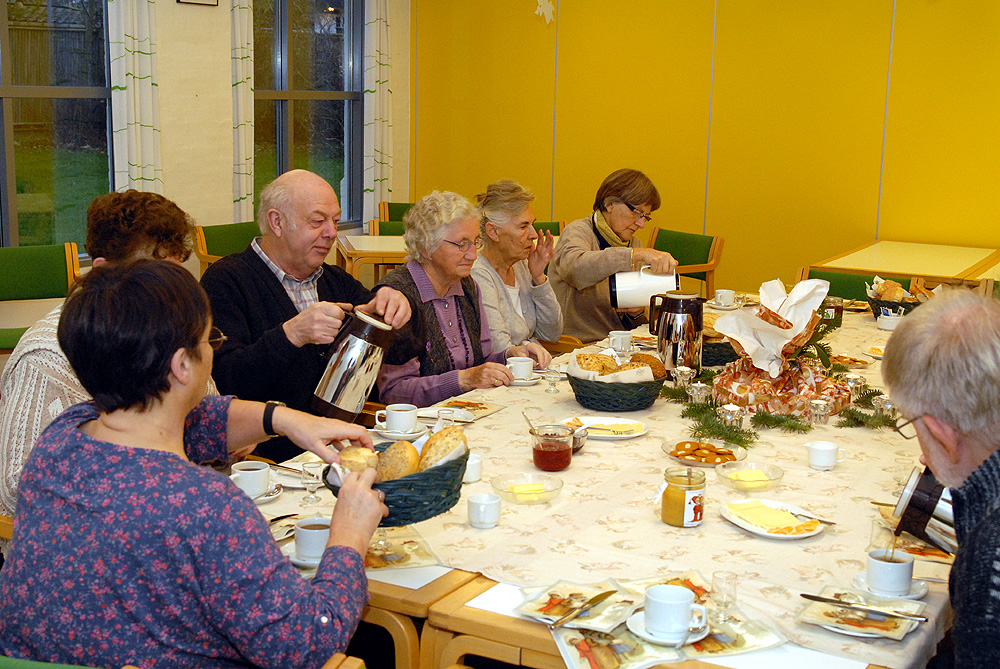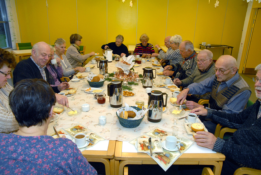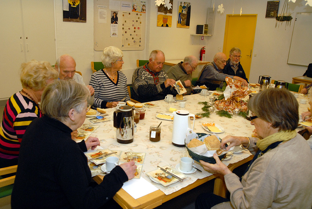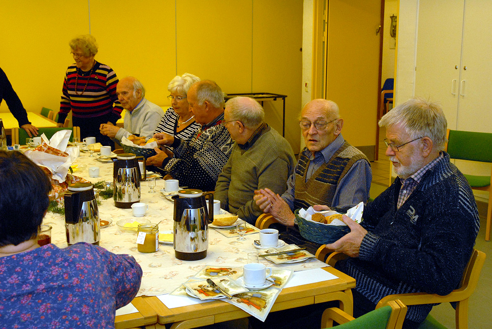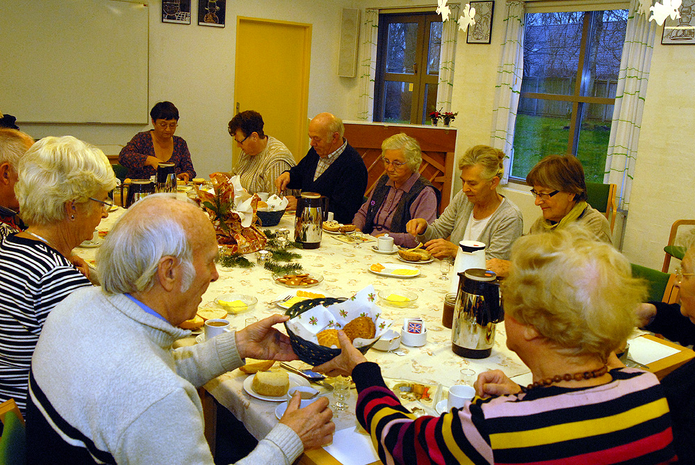 | Et par hyggelige timer i Mandagscaféen 2011. Caféen er åben den 2. mandag hver måned i Sognehuset fra kl. 9:30 til 11 med frisklavet kaffe, the og rundstykker. Caféen byder også på en hyggelig snak i et uforpligtende samvær med andre fra Mårslet, - og så er det tilmed helt gratis! Mandag den 12. december var sidste åbningsdag for Mandagscaféen i Sognehuset for i år. Udover kaffe og rundstykker, blev der budt på bankospil, hvor det helt overraskende viste sig at samtlige gæster vandt præmien med julegodter! En fin overraskelse sat i scene af Ingerlise Wendland. Caféen åbner igen mandag den 9. januar 2012 kl. 9:30. Foto: Jørgen Lauritsen ©2011