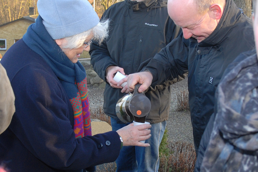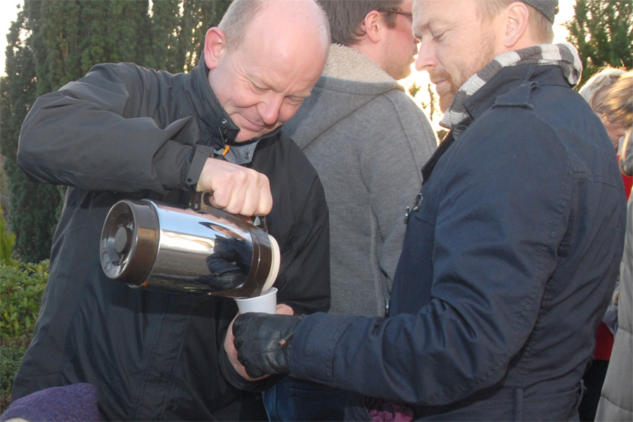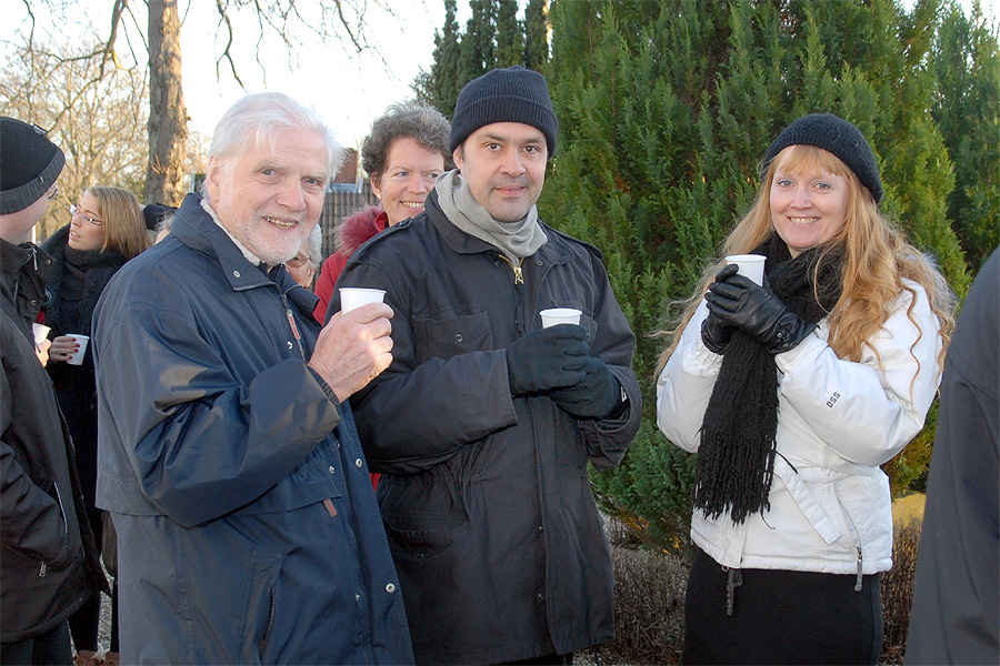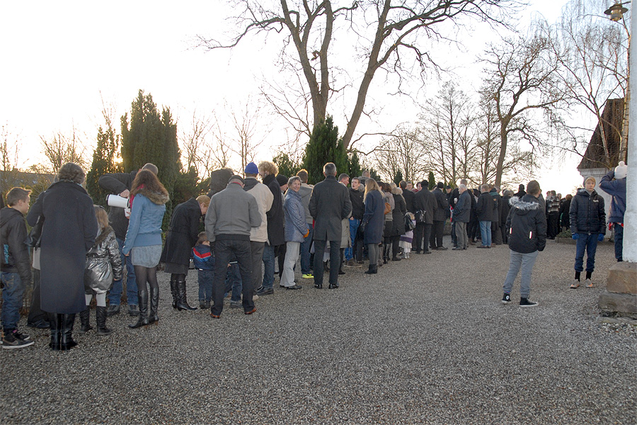 | Juleaften er traditionelt den dag i året, hvor der forventes flest i kirke. Således også i år og med fire gudstjenester var tallet sammenlagt på knap 1000 kirkegængere. Det gav lange køer kl. 14, 15 og 16, men til de mange ventende havde menighedsrådet sørget for en kop varm kaffe eller the i ventetiden. Vejret var - i modsætning til sidste år, hvor sneen lå højt - lunt med strålende sol og en temperatur på omkring +8°. Orgeltonerne blev, som det er tradition juleaften, ledsaget af Mette Rasmussen på trompet. foto: ©Jørgen Lauritsen