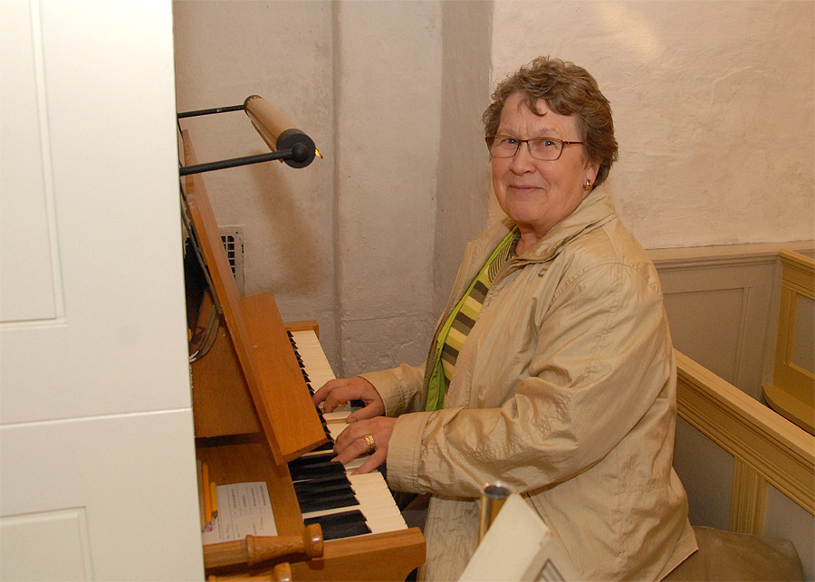 Else Kjemtrup, der er en habil organist, prøver her kirkens orgel.