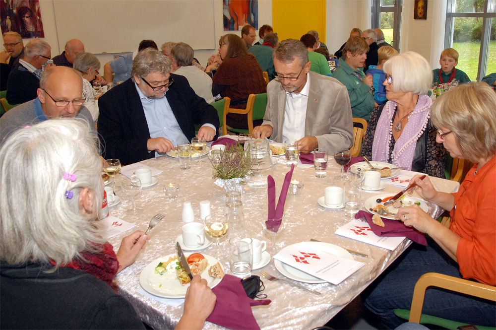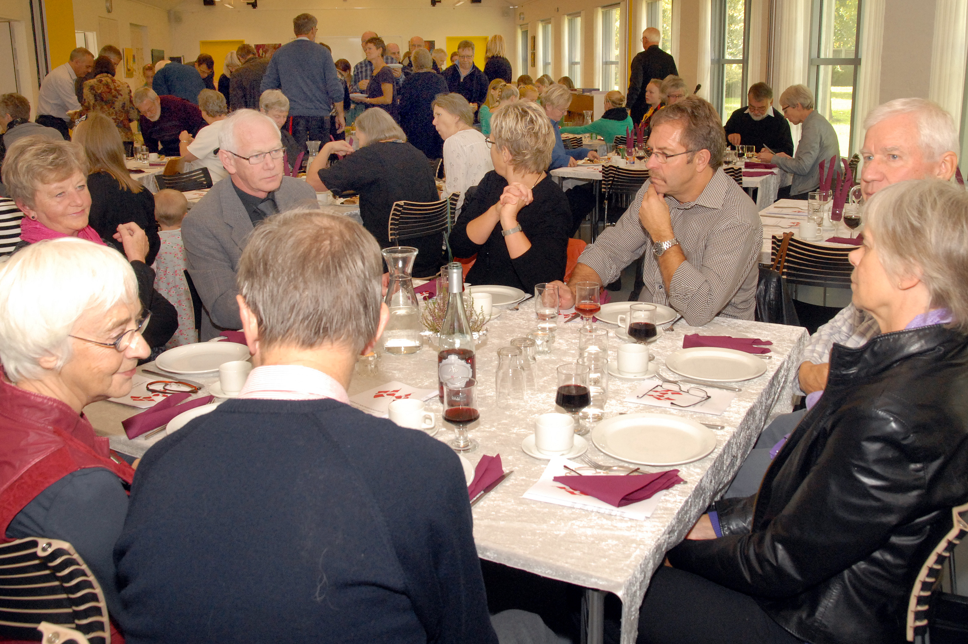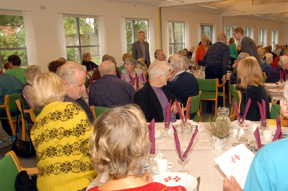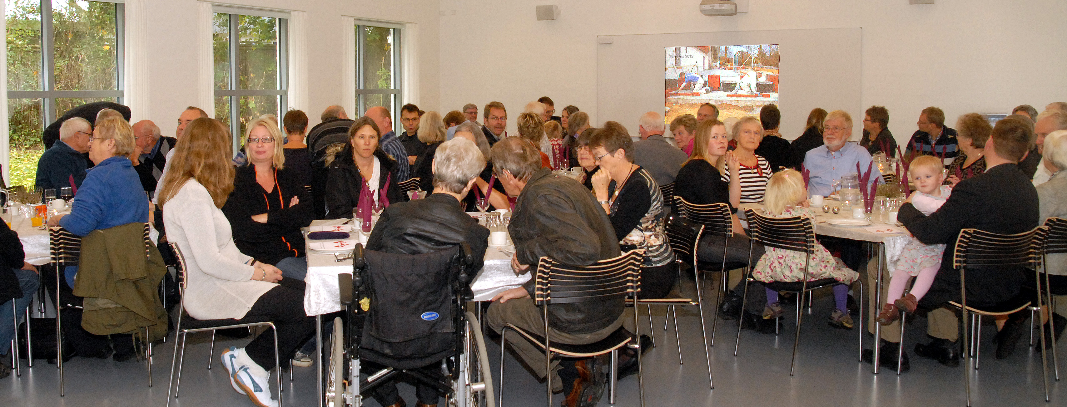 Søndag den 7. oktober 2012 blev det nye og ombyggede sognehus i Mårslet indviet. 150 gæster benyttede efter en let frokost lejligheden til at tage byggeriet nærmere i øjesyn, heriblandt biskop Kjeld Holm, Aarhus, og provst Knud-Erik Bager Jensen, Højbjerg. Der var mange rosende ord til de medvirkende i byggeprocessen fra byggeudvalgets formand, Knud Lunderskov, og menighedsrådets formand, Erik Sørensen. Hanne Torp, der var med, da det første sognehus blev projekteret, mindedes de beslutninger, der dengang blev taget med hensyn til kommende udvidelser, og biskop Kjeld Holm glædede sig over at tilbygningen ikke bare var en påklistret kasse, men at der her var tale om en helhedsløsning af meget høj kvalitet. Arkitekt Benny Andersens tale var en lovprisning, der udelukkende bestod af ord med begyndelsesbogstavet M for Mårslet! (Talen i fulde ordlyd herunder) Den musikalske underholdning var lagt i hænderne på Preben Ulvskov og Jørgen Kraglund. Herudover medvirkede desuden Mårslet Kirkes Kor under ledelse af Pia Labohn. foto: ©Jørgen Lauritsen Arkitekt Benny Andersens tale: Jeg har forsøgt at beskrive byggesagens forløb med lidt bogstavrim: M for Mårslet. M for menighedsråd - med manuskript: Menighedsrådet modtager melding med: ministerielle monetære midler - mange moneter, måske millioner? mild mammon! Mange muligheder, mange meninger - man må mobilisere MenighedsrådsUdvalget - M U / MU. MU's mangfoldige meninger målrettes, mange møder, mulighederne manifesteres. Mellemvejs meddeler man min mulige medvirken - (med makker): MU modtager mig medrivende motiverende. Mange møder, meninger modificeres - målsætninger modelleres, makkerskabet manøvrerer med modernisering, maksimalt medarbejdermiljø, mødelokaler- målskitser, myndighedskrav, minikon- firmandemes malerværksted - MU medvirker minutiøst - moderne musik- / medieanlæg, motetkor, mødregrupper, møbler, madhåndtering, mokkakopper - muligvis musselmalet? - månedsvis manøv-rering med mange muligheder. Måltegninger, materialelister, metodebeskrivelser meddeles mulige medvirkende mestre - mon ministeriets moneter modsvarer mestrenes mindstepriser? Mon missionen mislykkes? Mærker man musestille mismod? Mon materialet må makuleres? - MU med murrende mavepine! Men minsandten - murer- malermestre m.m. matcher ministeriets monetære midler - marginalt, men med moms! MU's magiske milepæl mod målet! MU med minus mavepine! Marts måned - Mårslets midterste matrikel modtager maskiner, massevis massive metalplader, mi- nigraver, maskinfolk: Muldafrømning - Moesgård mønstrer museumsfolk - muligvis middelalderminder, mikroskopisk mulighed, men måske møder minigraveren mønter, måske muslingemøddinger, mølædte mumier? - men museumsfolkene må modstræbende medgive - mosefundene mangler, men massevis moræneler, meget mudder! Maskinføreren modellerer møjsommeligt metervis murfundamenter - medfølgende muskuløse mænd mosler med murerbaljer. Manitou, mørtel, mursten. Maj måned - meget mere murværk - megatunge mellemdækselementer monteres - mastodontisk mobilkran må mobiliseres. Med mellemrum mange møder, mandskabsvognen myldrer med mappemænd - man mødes med mestre, murer, maler, medarbejdere, mokka - MU medvirker. Mødeplaner, materialeleverancer, metoder mingeleres, merudgifter minimeres - MU medvirker meget. Markant mærker man mestrenes medspil - meget mindeværdigt. Mestrene modarbejder mulige misforståelser / murrende miskmask med meningsfyldt mindelighed. Midsommer med maskiner, mineraluld, multiplader, masonite. massivtræ. montagearbejder, mestrene manøvrerer målbevidst - med myreflittige medarbejdere (mellem måltiderne), malerbøtter, mobilvæg. medieanlæg - MU medvirker meget - møbler, modtagekontrol, mangelliste - MU medvirker minutiøst! >BR> MU møder målet - MU's målbevidste millionmanøvre - mange muntre minder, mange møder, man mindes mestrenes medspil. man mindes MU's medleven, måske mest medmenneskelighed - MU magtede missionen - minsæl MU's mesterværk! Tillykke med de nye omgivelser! (eller for at blive i sproget: Mega-held mæ'et). -----------------------------------