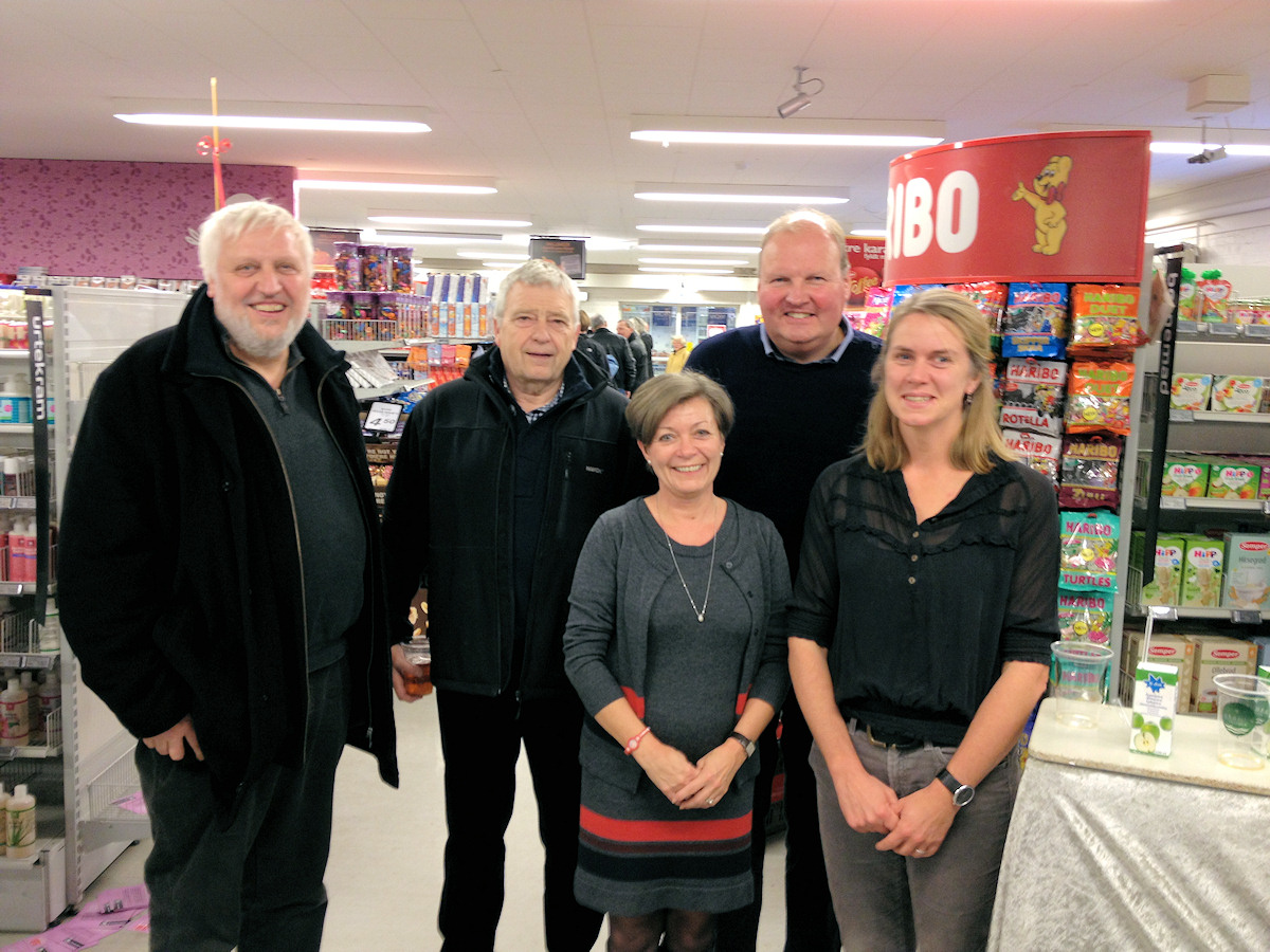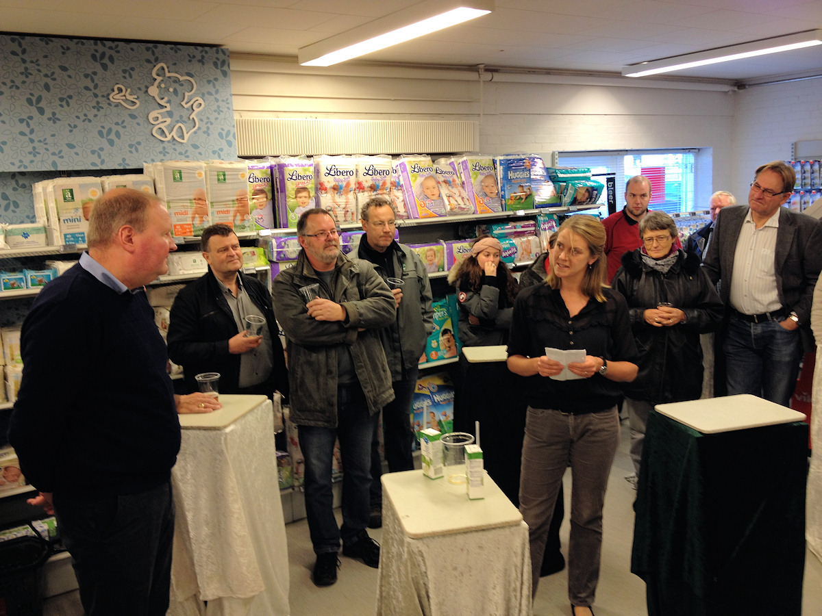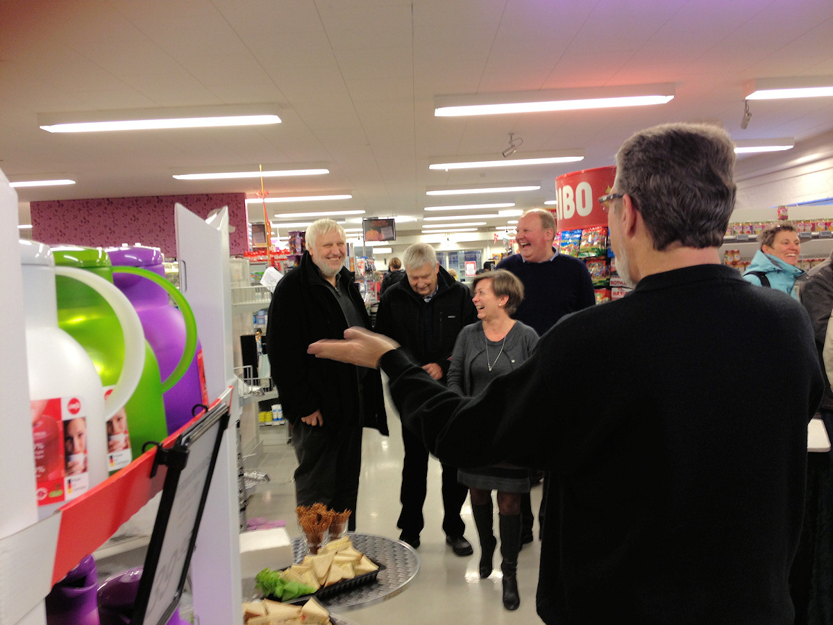 | Fredag den 26. oktober kl. 16:00 inviterede bestyrelsen for SuperBrugsen, Mårslet, til afskedsreception for uddeler Jesper Nielsen, der har søgt nye udfordringer, og rigtig mange mødte frem for at takke Jesper for det arbejde, han har lagt i at gøre SuperBrugsen i Mårslet til det, den er i dag. Som én af talerne udtrykte det: "Det svarer jo nærmest til at sælge sand i Sahara." Det sidste billede i serien viser Jesper sammen de formænd, der har været i SuperBrugsen, igennem de 16 år hvor han har været Brugsens uddeler. Det er fra venstre mod højre: Bent Bauning - Lars Berggreen Rasmussen - Ulla Reintoft Henriksen - og nuværende Anne-Mette Bay Bjørn. 27/10 2012 foto: ©2012 Kirsten & Poul Granslev