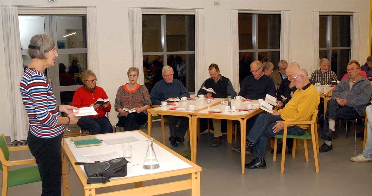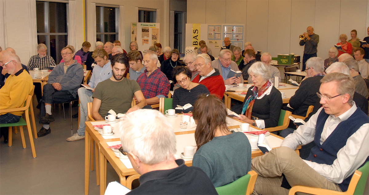 Tove Uth fortalte levende om denne enestående mand, der helhjertet gik ind i modstandskampen lige fra krigens første dag. Tove Uth fortalte også om, hvad der videre skete i Toldstrups liv efter krigens afslutning, og det var ikke så lidt, Jens Toldstrup fik prøvet. Også skuffelsen, da Danmark tilsluttede sig EF. Efter foredraget var der lejlighed til at stille spørgsmål til Tove Uth, og hele aftenen forløb i en meget hyggelig atmosfære med sange fra Højskolesangbogen til akkompagnement af gemalen Svend Uth på flygelhorn. foto: ©2012 Jørgen Lauritsen