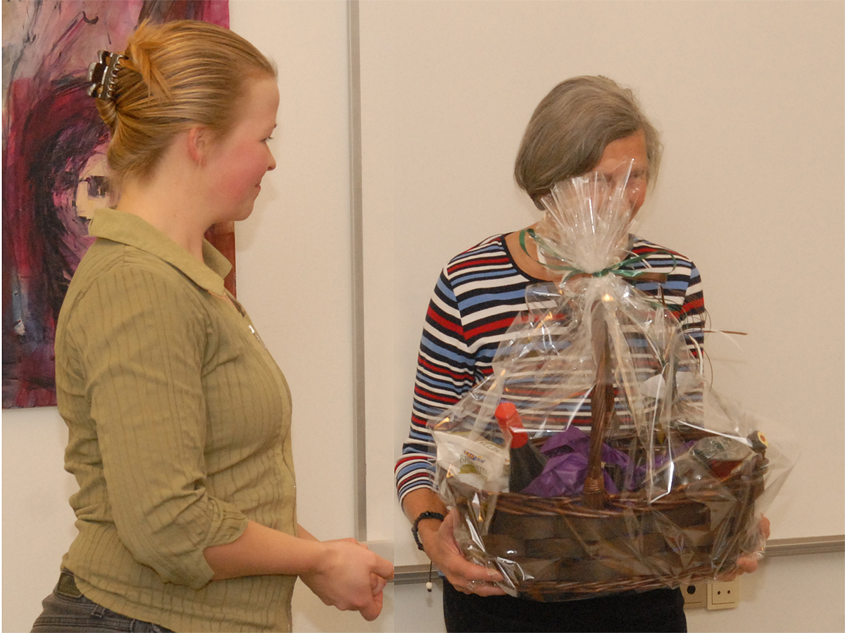Formanden for Lokalhistorisk Forening Anne Marie Dalsgaard Mikkelsen takkede for foredraget og overrakte den næsten skjulte Tove Uth en fyldt kurv.