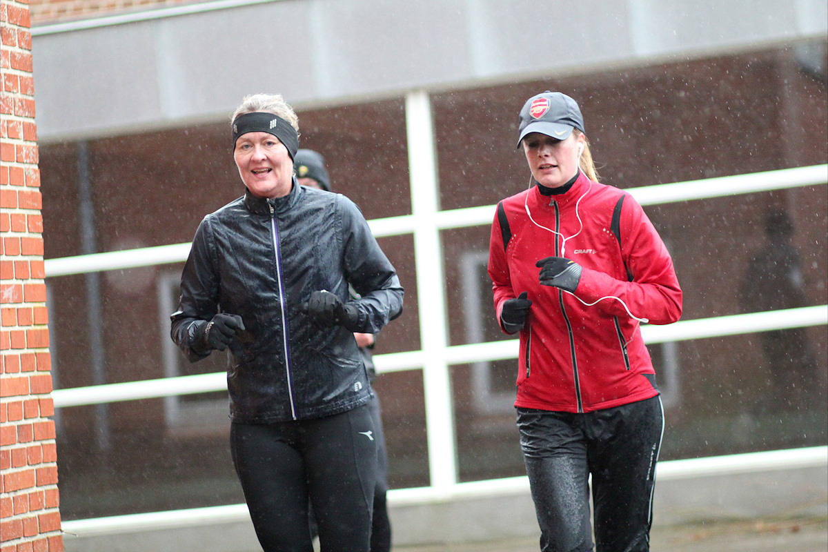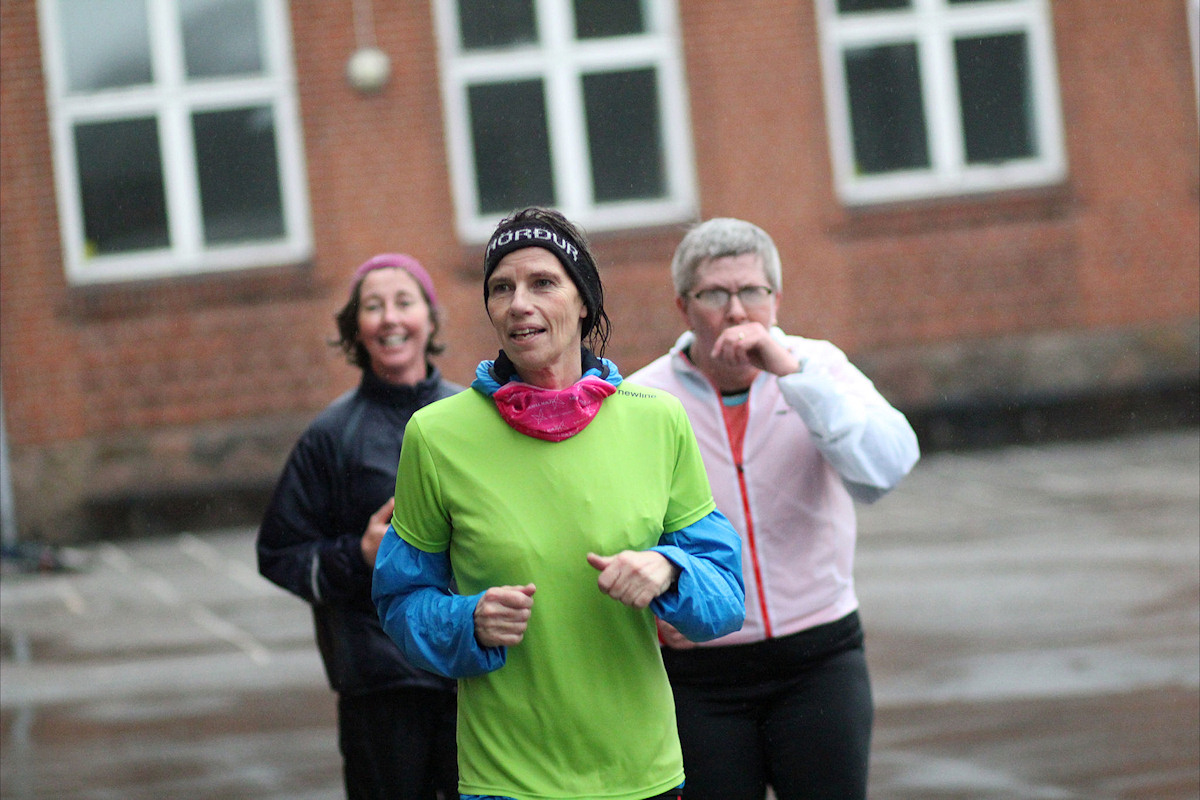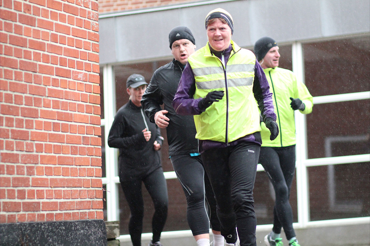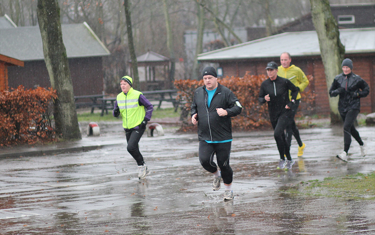 | 15 af efterårets 50 løbemotionister i TMG motions løbeskole holdt humøret højt og gejsten gæv, da de trodsede søndagens møgregn til et sløjfeløb på skolens område. Med det sluttede de efterårets 12 ugers løbeskole med en løbetur hjulpet af løbetrænerne, cacao og Monas hjemmebagte boller i HalHuset. Løbeskolen starter igen i tre grupper til april. (bille) foto: ©2012 Steen Nielsen