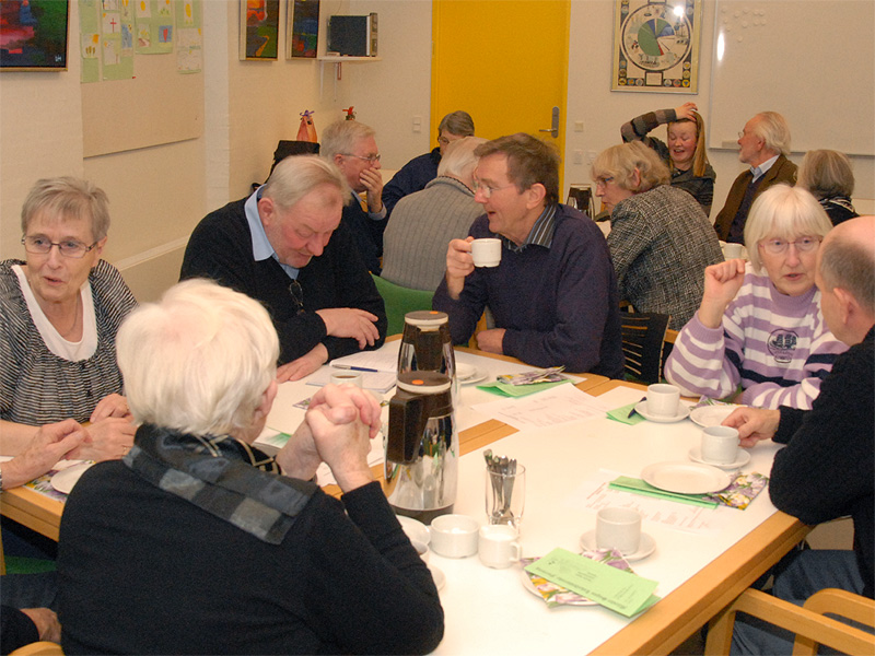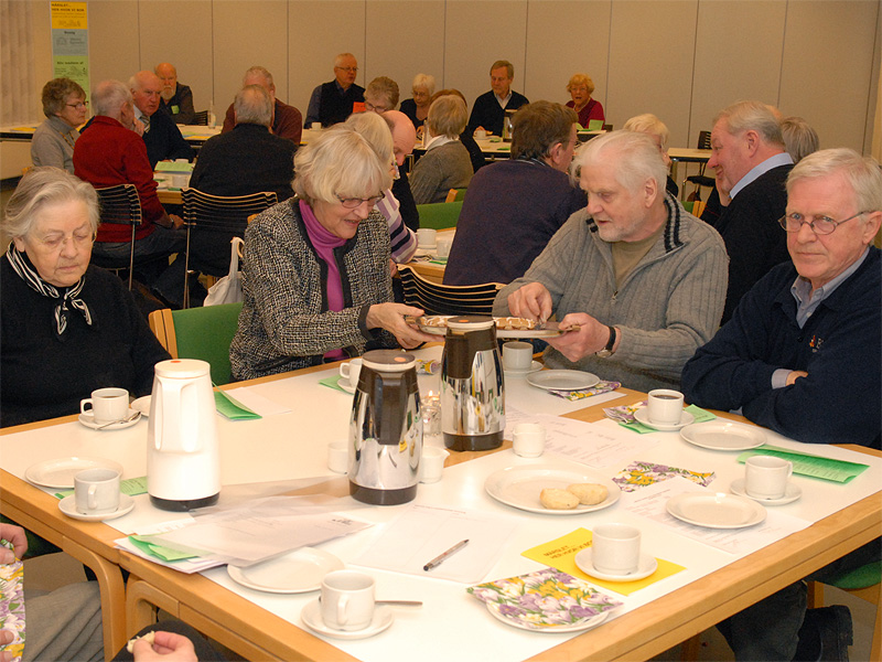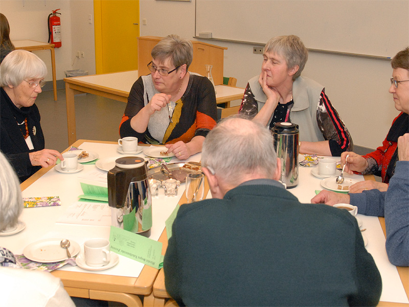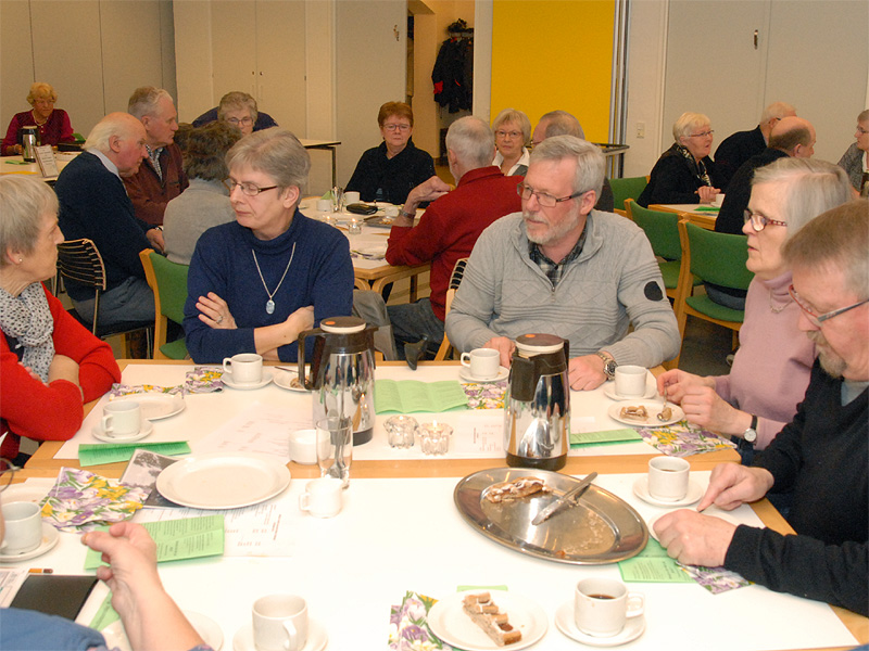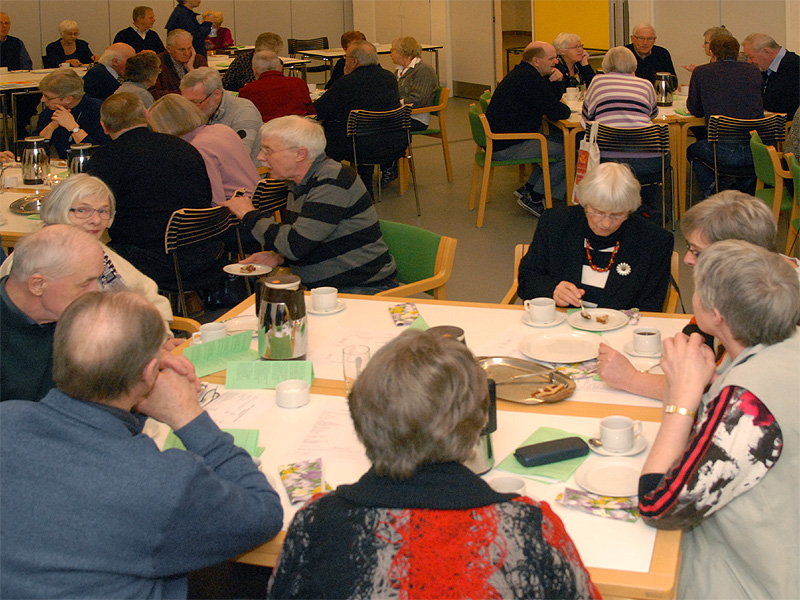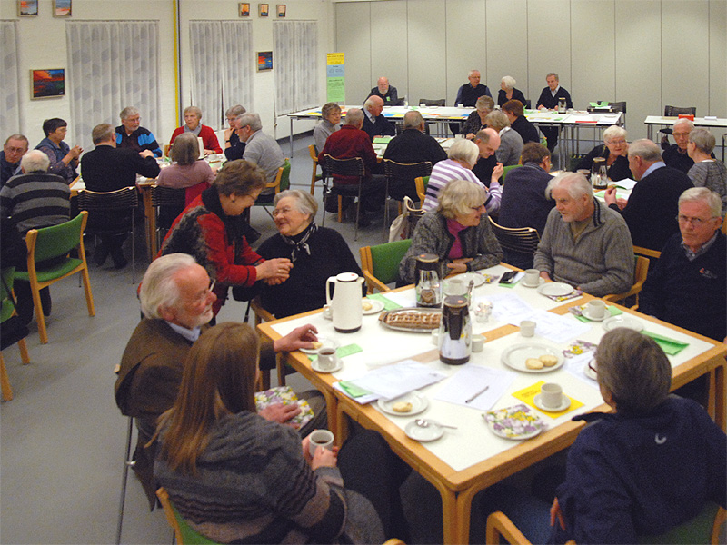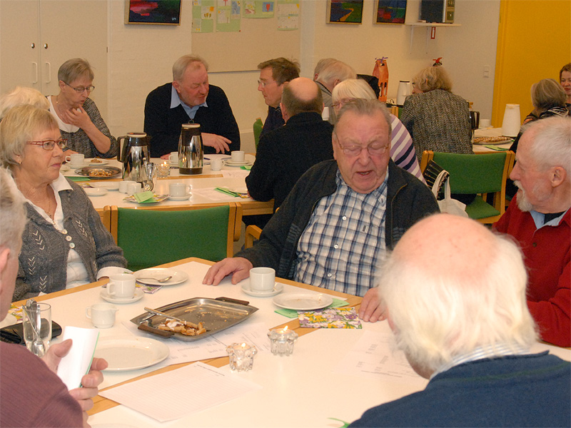 | Det var på ingen måde et anstrengende job Hans Vedholm havde som dirigent ved den årlige generalforsamling i Mårslet Sogns Lokalhistoriske Forening, der blev afholdt i Sognehuset tirsdag den 19. marts. To nye ansigter kom ind i bestyrelsen, Kirsten Cramer, Mårslet og Jens Noes, Langballe og ud trådte Susanne og Jørgen Lauritsen, Mårslet. Efter kaffen gav formanden, Anne Marie Dalsgaard, ordet til arkitekt Ib Møller, der med udgangspunkt i arbejdet med restaureringen af Vilhelmsborg, fortalte om sit samarbejde med de daværende kommuner syd for Aarhus. foto: ©Jørgen Lauritsen
