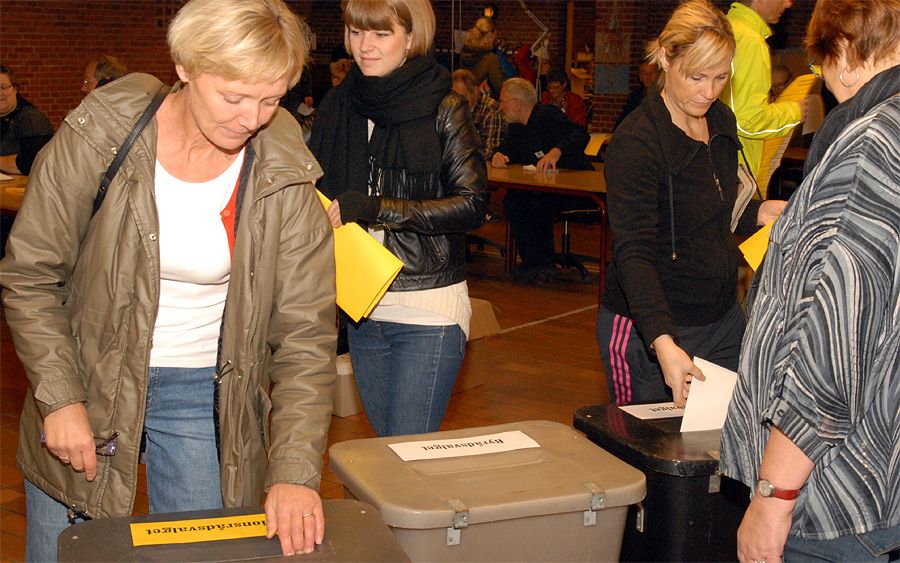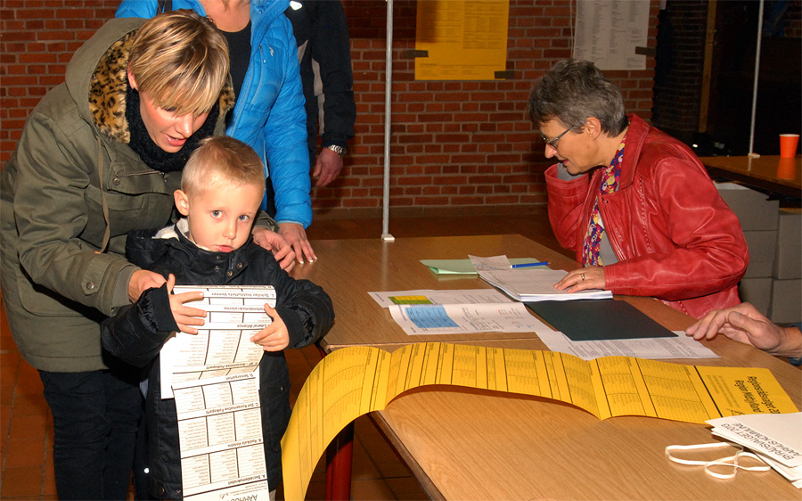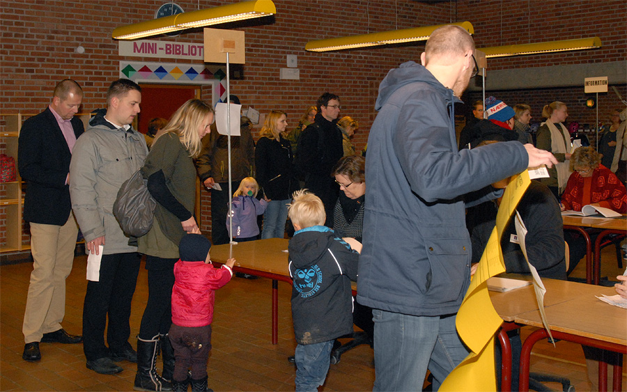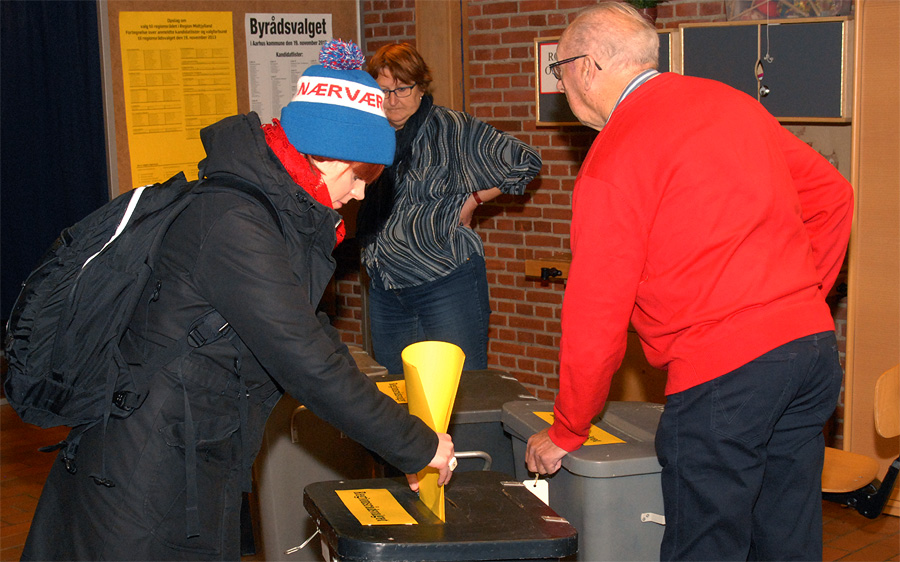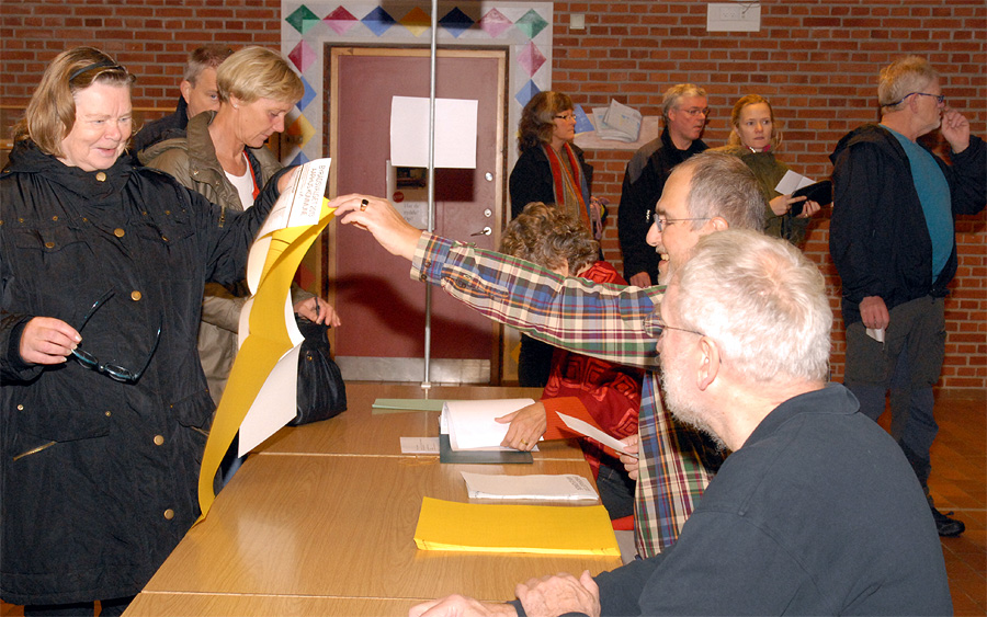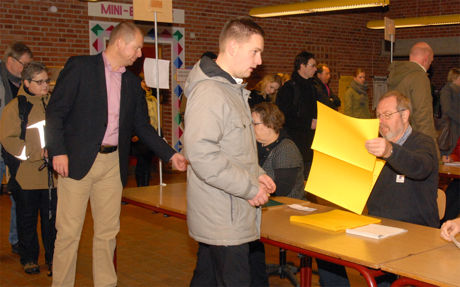 | Kommunal- og regionsvalg 2013 Med et par minutters forsinkelse åbnede Torben Wandall (SF) kommunalvalget på Mårslet Skole kl. 9:02, og der var fra starten stor interesse for at afgive sin stemme. Det er noget af et par "smørrebrødssedler", der skal tackles ned i stemmeurnerne, som må være bugnende, når valget slutter i aften kl. 20:00. foto: ©Jørgen Lauritsen
