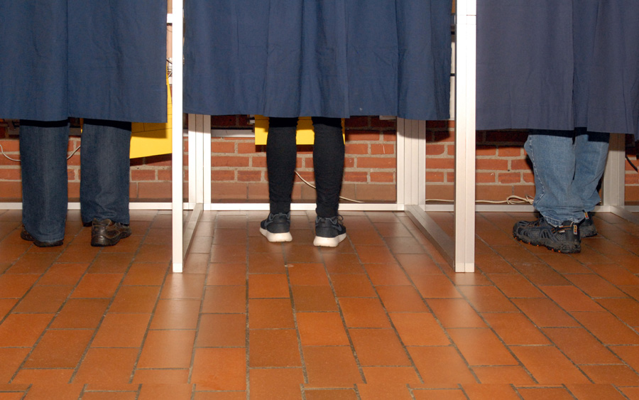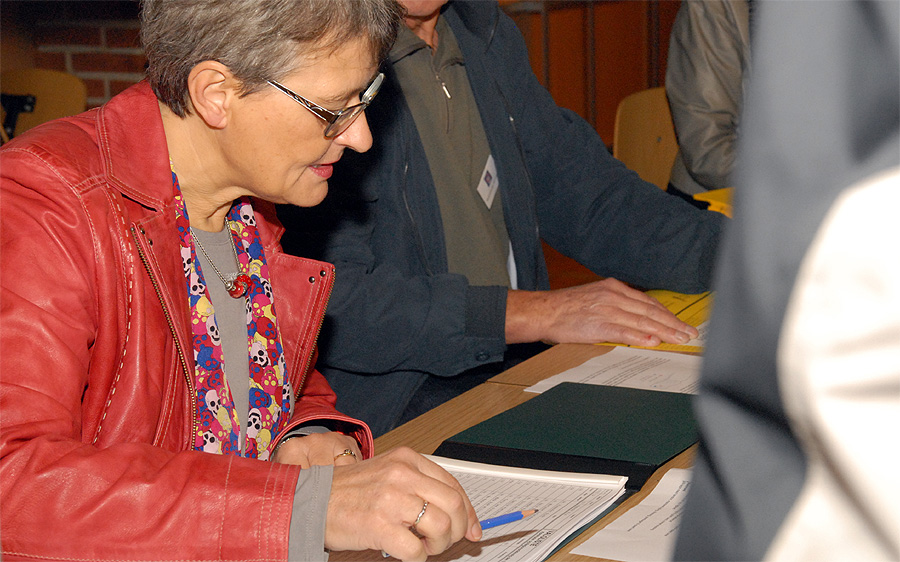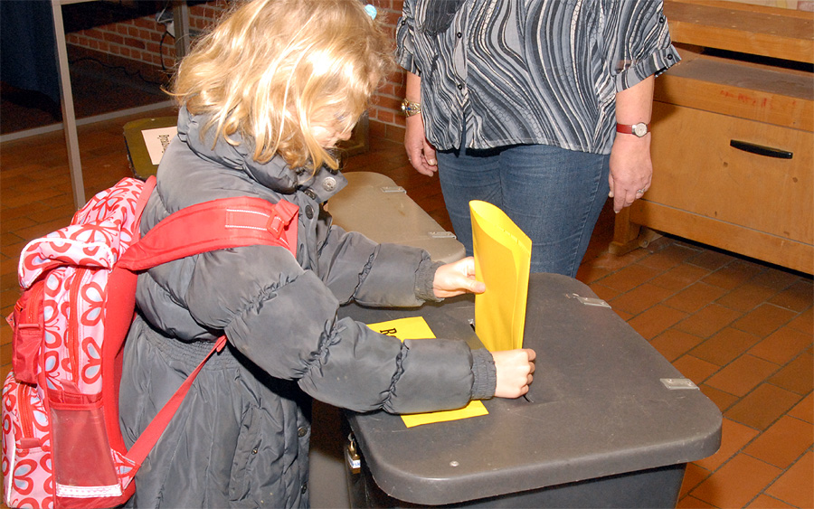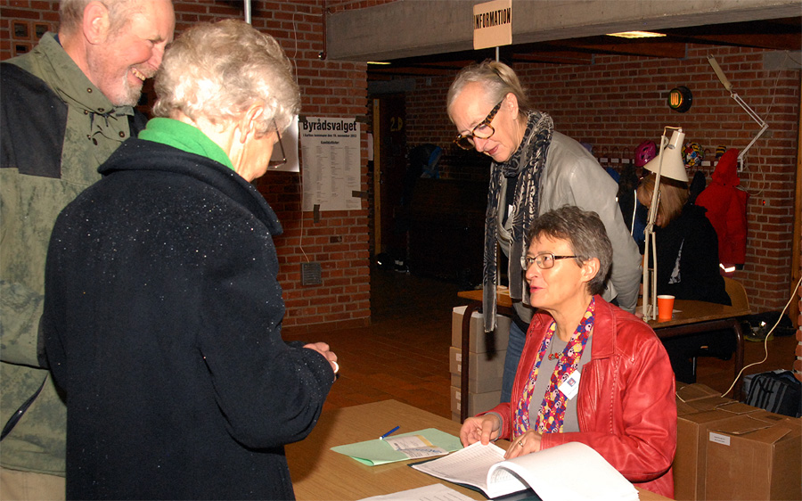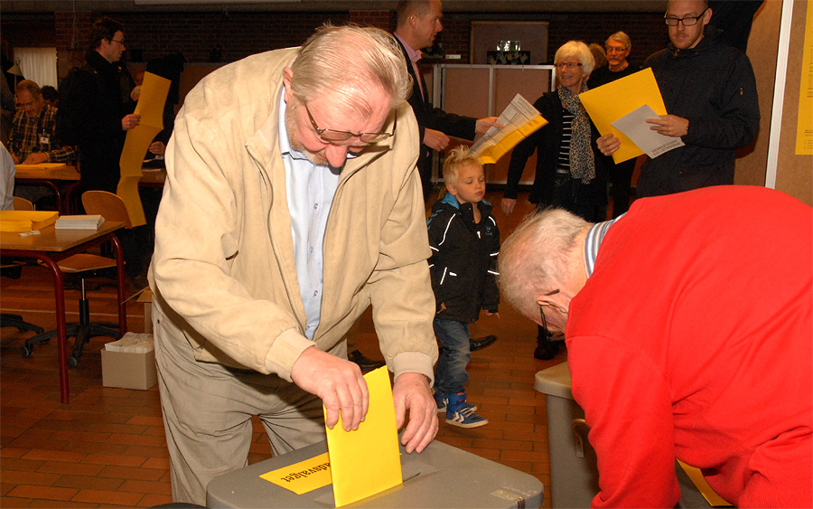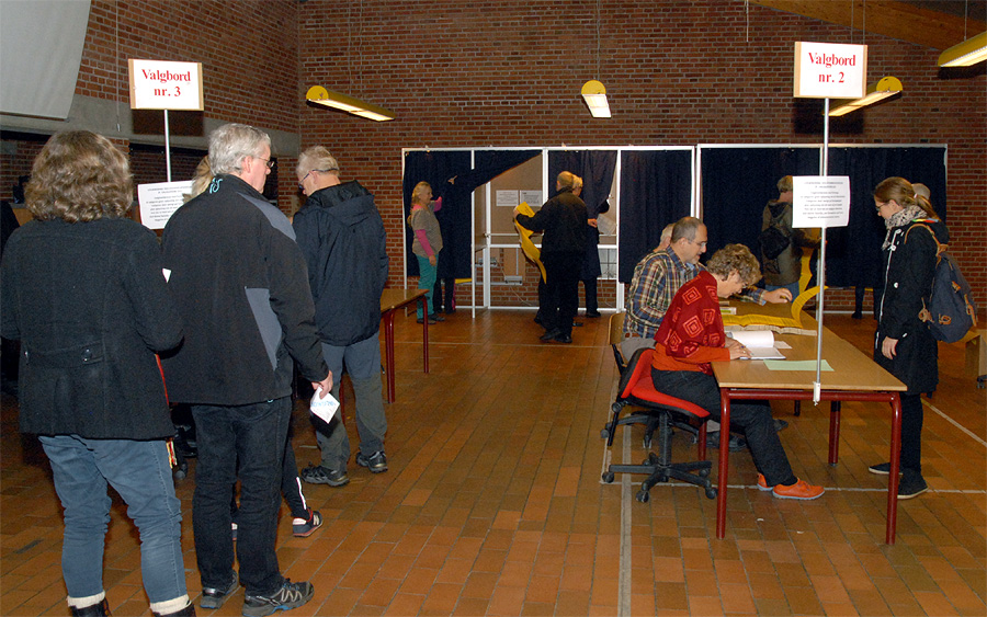 | Kommunal- og regionsvalg 2013 Med et par minutters forsinkelse åbnede Torben Wandall (SF) kommunalvalget på Mårslet Skole kl. 9:02, og der var fra starten stor interesse for at afgive sin stemme. Det er noget af et par "smørrebrødssedler", der skal tackles ned i stemmeurnerne, som må være bugnende, når valget slutter i aften kl. 20:00. foto: ©Jørgen Lauritsen