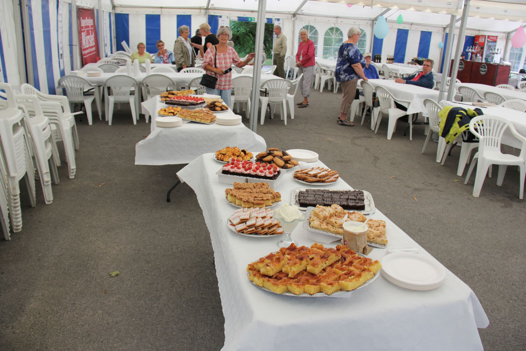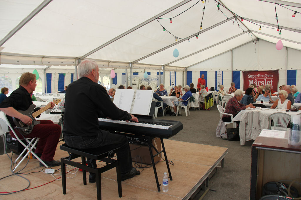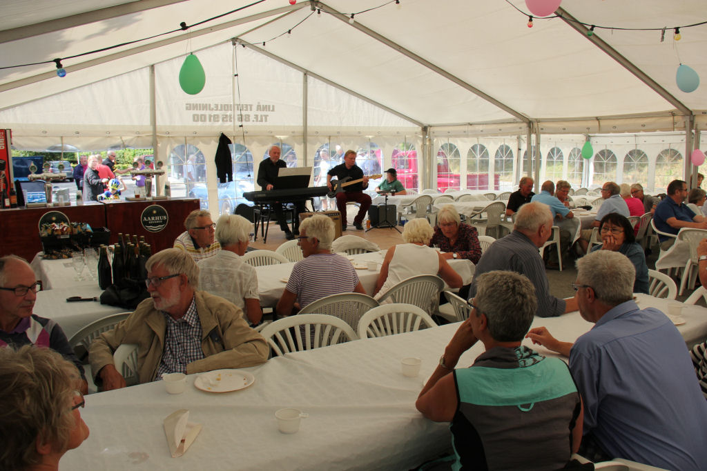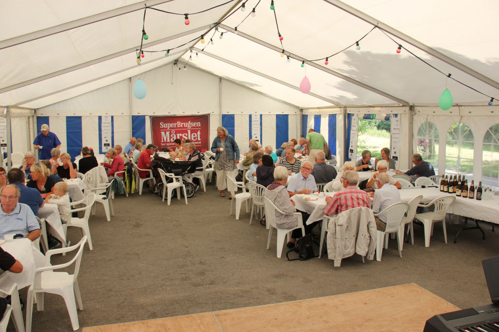 | Mårslet Byfest - for de rigtige voksen Sjældent har Mårslet oplevet et mere overdådig kagebord et kagebord der var leveret af vores lokale bager. I dag var teltet åbnet for "De rigtigt voksne" og mange havde lagt deres vej forbi for at nyde kagebordet og kaffen - og de blev langt fra snydt. Kapelmester Jens Erik og Henning spillede teltet op med store klapsalver til følge. Klaus Pauls og Niels Verner med venner sørgede for, at der var mulighed for at "sparke dæk" da de kom og præsenterede deres velpolerede amerikanere. En eftermiddag med masser af snak og hyggeligt samvær. foto: ©Ole S. Gade