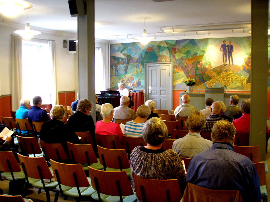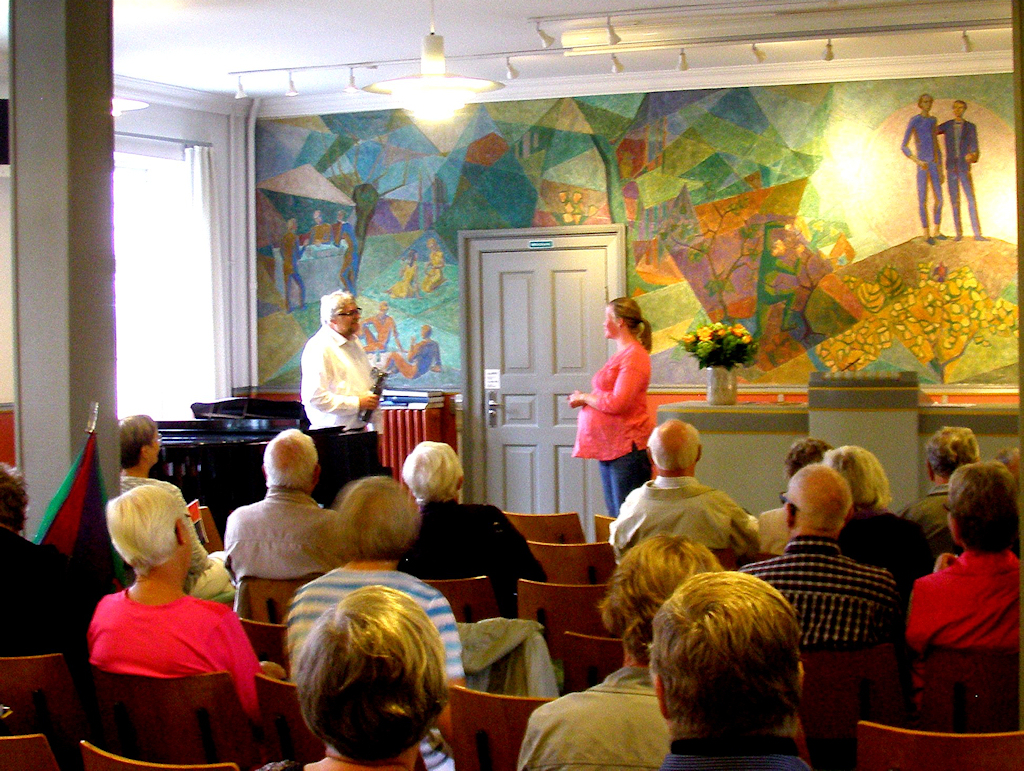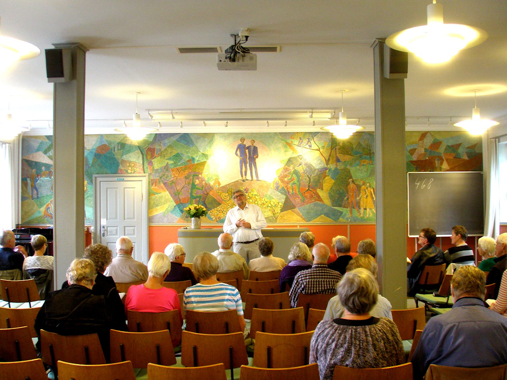 | Mårslet Sogns Lokalhistoriske Forening på Testrup Højskole. Festugens arrangement på Testrup Højskole var en stor succes. Vejrguderne havde forsøgt at skræmme os væk med uopholdelig kraftig regn, som ikke just indbød til at tage turen til Testrup til fods. Højskoleforstander Jørgen Carlsen bød velkommen i foredragssalen, hvor han, efter at vi havde sunget Ludvig Holsteins 'Det lysner over agres felt', fortalte om højskolebevægelsen gennem tiden og i særdeleshed om Testrup Højskole, der blev grundlagt i 1866 takket være Jens Nørregaard. Mange højskoler opstod efter tabet af Sønderjylland i 1864, men ikke alle overlevede. Jens Nørregaard var forstander til 1908, men derefter gik det noget tilbage for Testrup Højskole, som i 1927 blev overtaget af Dansk Sygeplejeråd, der i en årrække drev den som forskole for vordende sygeplejersker. Dette fortsatte til 1974, hvorefter højskolen atter overgik til at være folkehøjskole og tilmed en af landets fremmeste. Jørgen Carlsen gennemgik derpå Holmer Triers store vægmaleri inspireret af H.C. Andersens Klokken, der symboliserer de muligheder, som foreligger, når man vil videre i livet, uanset om man er kongesøn eller en fattig dreng. Inden der var kaffebord, måtte vi en tur ud i regnen, hvor Jørgen Carlsen fortsatte sin fortælling om højskolens bygninger, mindesmærker og monumenter. Den seneste bygning er det smukke arkitekttegnede musikhus. Kaffebordet i spisesalen var overdådigt med boller, kringle, ost, syltetøj, honning og småkager, alt var hjemmelavet på højskolen. Dertil skænkede MSLF ud af brændevinen fremstillet til lejligheden af Mårslet Brændevinslaug. Alt sammen bekom det os særdeles godt, og ikke mindst de af os, der under den udendørs gennemgang ikke havde været bevæbnet med en paraply. I spisesalen var fremlagt diverse skrifter og brochurer, som man kunne forsyne sig med og derved få et indtryk af de mange tilbud, der gives, uden at man behøver at melde sig til et helt højskoleophold. Tilbage i foredragssalen fortalte Jørgen Carlsen, efter at vi havde sunget Jeppe Aakjærs 'Som dybest brønd giver altid klarest vand', om sangens forfatter og navnlig om den af nogle forkert opfattede linje 'Du pusling-land, som hygger dig i smug' med relation til første verdenskrig. Aakjær var pacifist og ønskede ikke krigen. Det var atter et interessant foredrag. Eftermiddagen sluttede med sangen Madeleine af den alsiske digter Martin N. Hansen. Et virkeligt godt arrangement, som formanden for MSLF Anne Marie Dalsgaard Mikkelsen takkede Jørgen Carlsen for med overrækkelsen af en flaske til senere vederkvægelse. Tekst: Carl Gerh. L. Crone foto: ©Erik Moldt