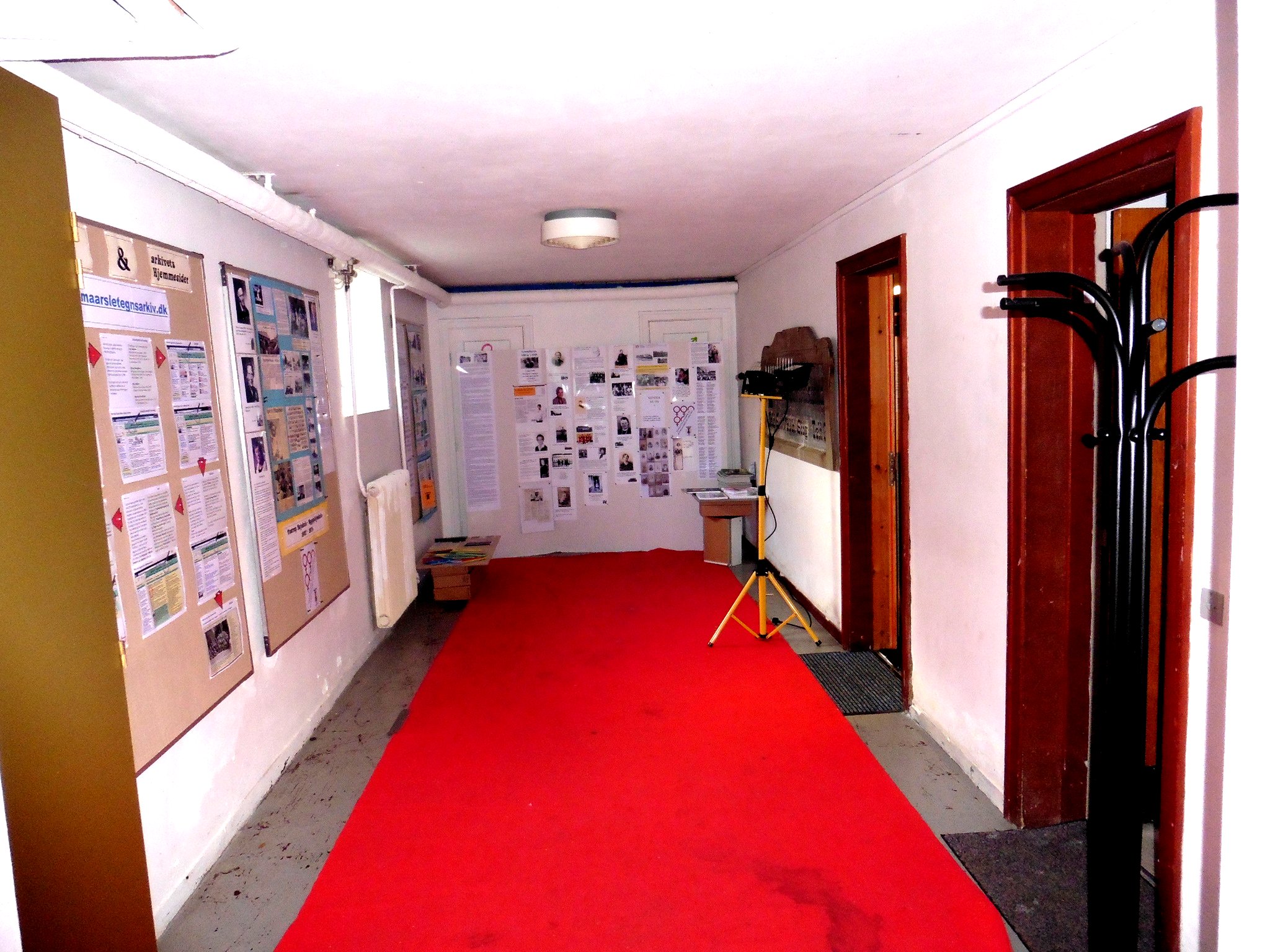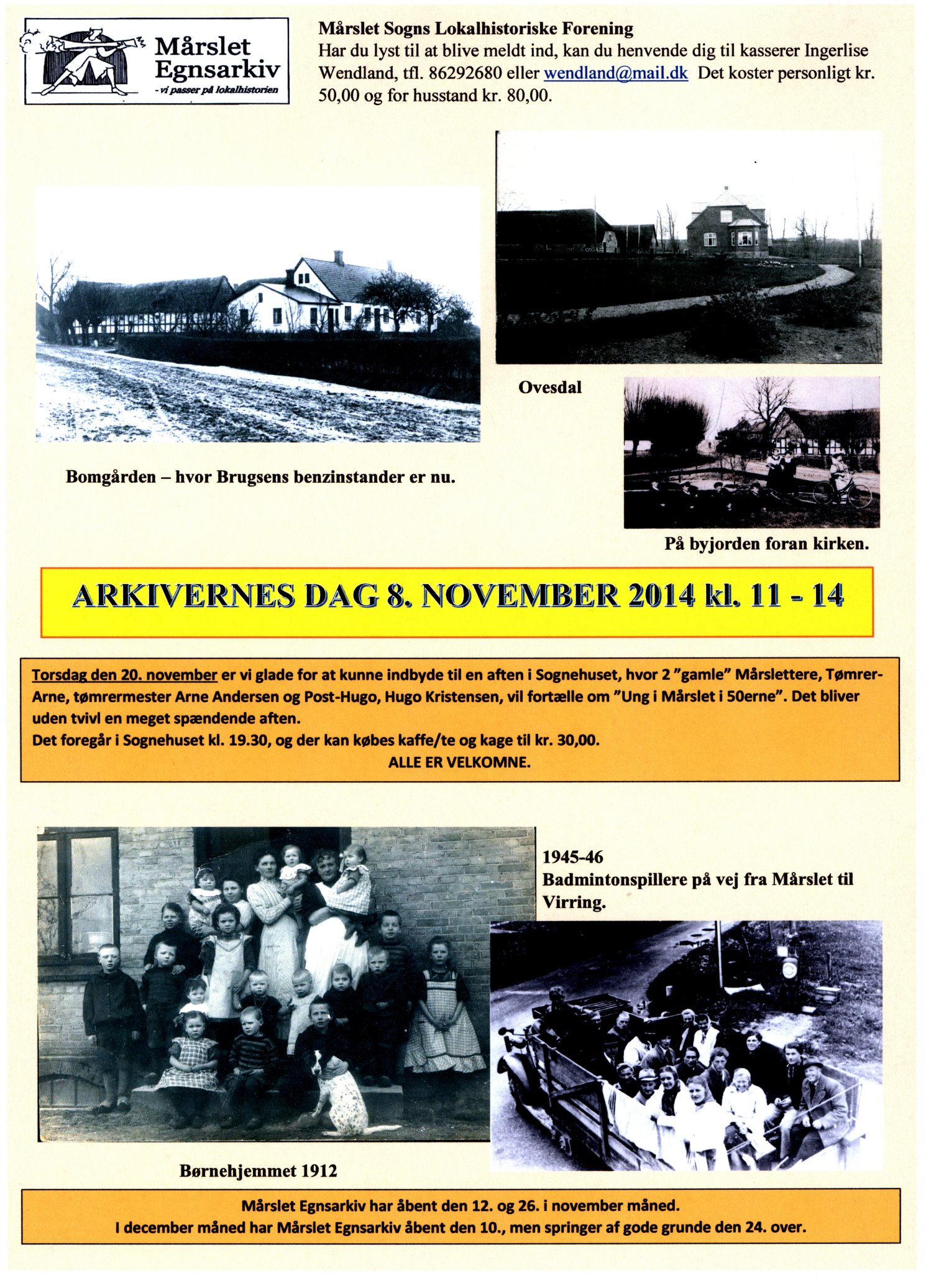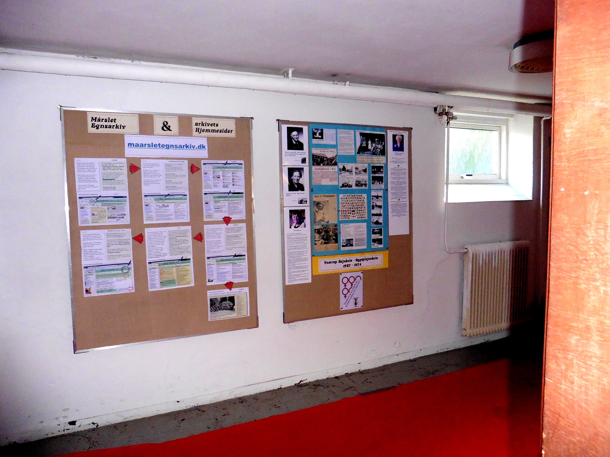 | Arkivernes Dag - lørdag den 8. november 2014. 'Arkivernes Dag' afholdes af de fleste af landets lokalarkiver den anden lørdag i november måned. Mårslet Egnsarkiv havde i dagens anledning rullet den røde løber ud og på gangen var arkivets mange faner ude at blive luftet. Endvidere var der på gangen opslag med billeder og historier om kvinder med tilknytning til Mårslet Sogn. Inde i arkivet var der fremlagt flere af arkivets klenodier, gamle protokoller der er afleveret til arkivet til opbevaring. Knap 25 personer havde afsat tid til et besøg på egnsarkivet for at se hvad vi opbevares på arkivet. Over en kop kaffe blev der livligt snakket lokalhistorie, mest med ældre mårslet borgere, men også nogle yngre. Alt i alt en vellykket dag. foto: ©Erik Moldt