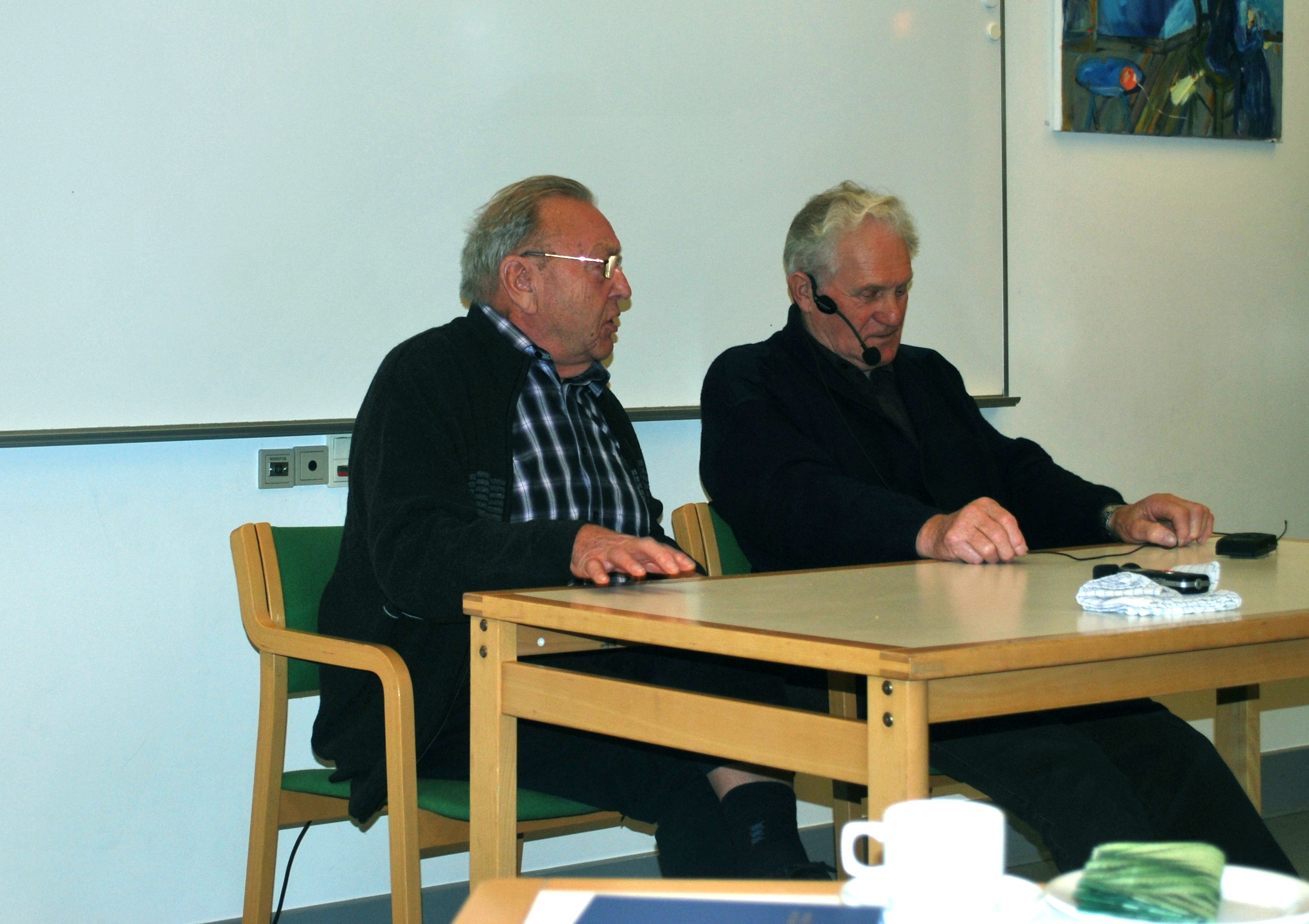 | Lokalhistorisk aften i Mårslet Sogns Lokalhistoriske Forening Torsdag den 20. november var der lokalhistorisk aften i MSLF, hvor to så kendte Mårslet-boere som Post-Hugo og Tømrer-Arne med de mere borgerlige navne Hugo Kristensen og Arne Andersen veloplagte fortalte om oplevelser, de har haft i det gamle Mårslet. Det blev noget af et tilløbsstykke, for sjældent har der været så mange tilhørere til disse lokalhistoriske aftener som ved denne, hvor der måtte sættes ekstra stole ind. Dog var der ikke flere, end at alle, så vidt vides, fik både kaffe og dejligt hjemmebagt brød i pausen. Det var ikke mindst Arnes og Hugos mere morsomme oplevelser serveret på deres tørre, lune måde, som tilhørerne kunne more sig over. Vi kom helt tilbage i deres allerførste ungdomstid, da der åbenbart var mere liv i Mårslet, end der er i dag. Og da de krydrede deres oplevelser med anekdoter, der implicerede mange af de hedengangne Mårslettere, var der lutter smil i ansigterne på tilhørerne. Det blev en lang, men aldeles ikke kedelig forestilling, for publikum blev ved med at stille spørgsmål til de to herrer om deres oplevelser, eller oplevelserne blev suppleret med yderligere kommentarer fra salen. Til sidst syntes formand Anne Marie Dalsgaard Mikkelsen, at nu trængte de to herrer vist til at slippe, og hun takkede dem og overrakte dem hver en erkendtlighed for deres vellykkede underholdning. Anne Marie benyttede derpå lejligheden til at gøre opmærksom på, at den godt 300 sider digre bog Mårslet her hvor vi bor med Hans Møllers skrifter om Mårslet vil være "på gaden" og klar til julehandelen ved præsentationen i Brugsen fredag den 28. og ved julestuerne i Borgerhuset og på Kildevang den 29. og 30. november. Aftenen sluttede, som den begyndte, med en sang fra Højskolesangbogen. Tekst og foto: ©Carl Gerhard Crone