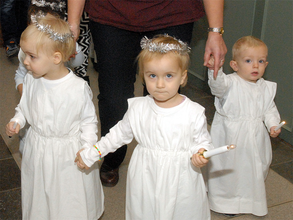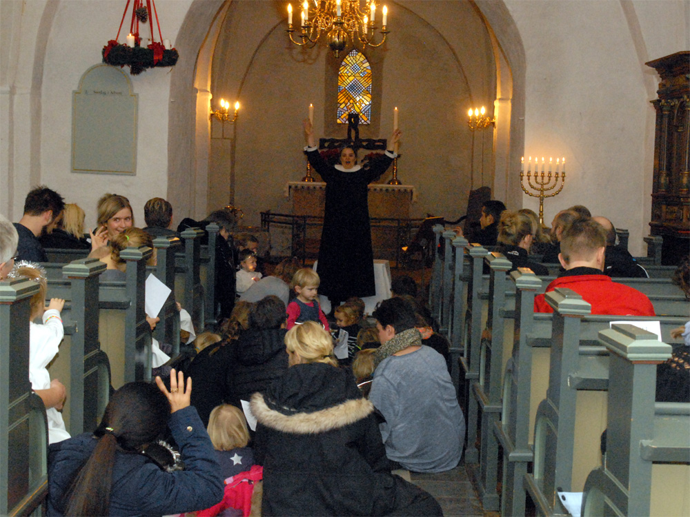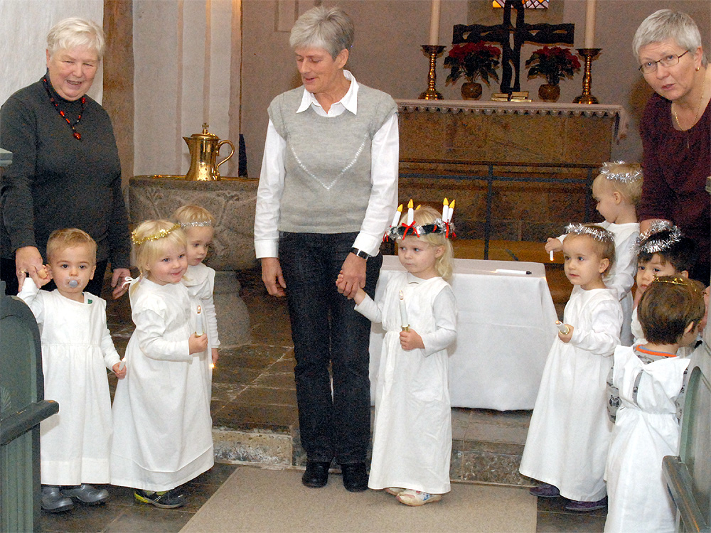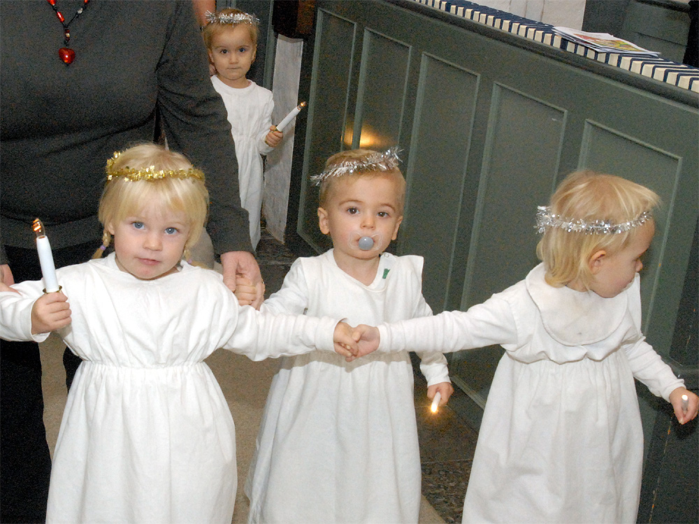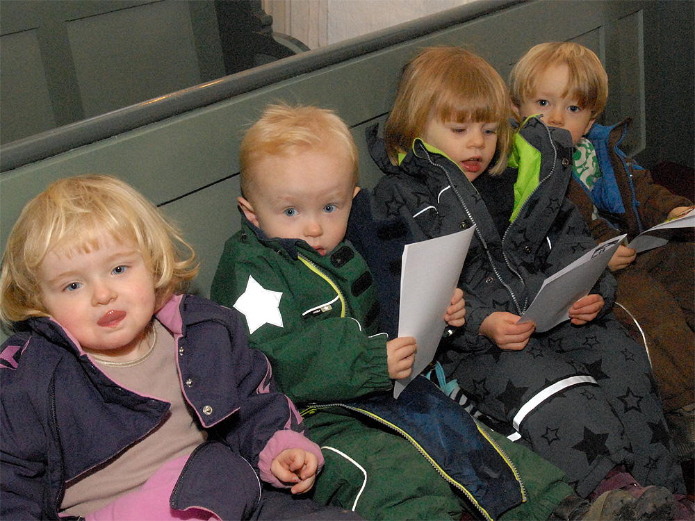 | Engletræf Julegudstjeneste for de mindste. Onsdag den 3. og torsdag den 4. december holdtes der om formiddagen i Mårslet Kirke en lille julegudstjeneste for alle dagplejere, vuggestuer og andet småfolk i Mårslet. Dagplejebørnene indledte gudstjenesten med et lille luciaoptog, og sammen blev der sunget et par julesalmer med fagter, og sognepræst Mette Maria Kristensen fortalte på levende vis juleevangeliet. Efterfølgende var der hyggearrangement for dagplejebørnene i Sognehuset. foto: ©Jørgen Lauritsen