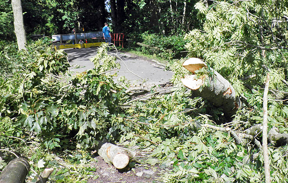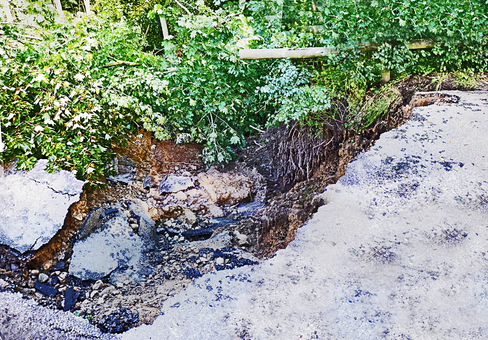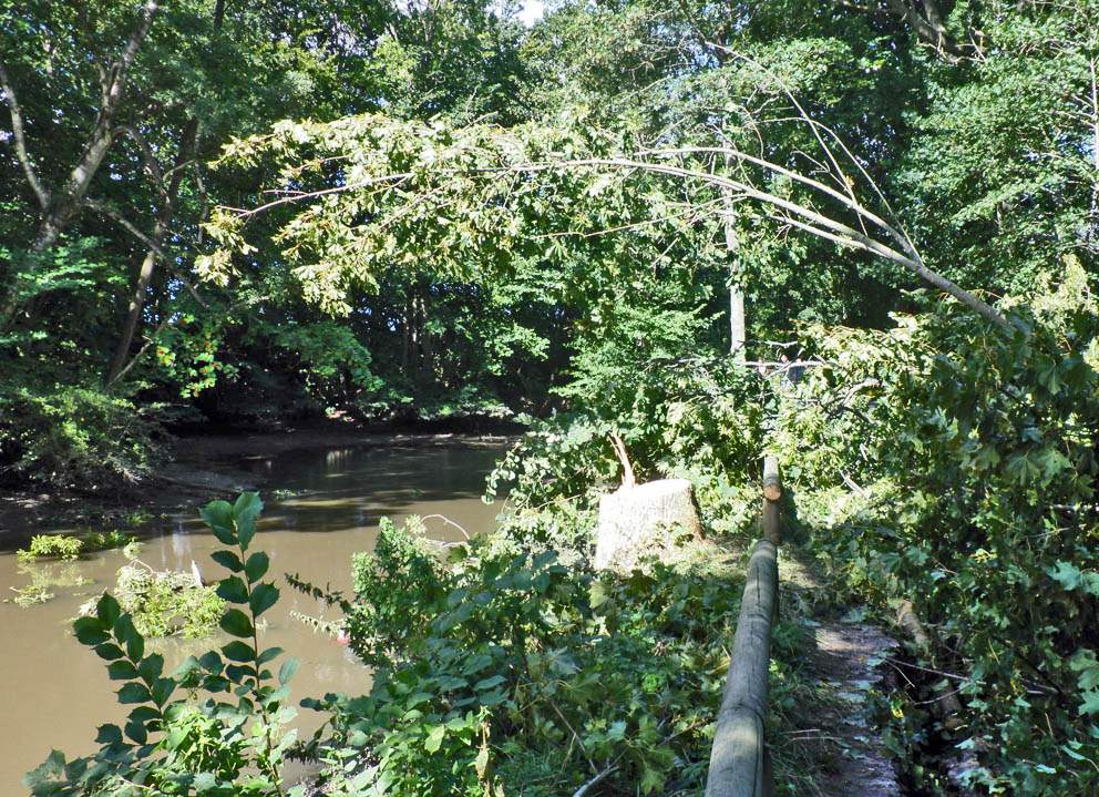 | Dæmnings skade ved Vilhelmsborg Sø Bortskylningen af den gamle dæmning ved Vilhelmsborg Sø, som angiveligt har båret H.C. Andersens fødder, når han vandrede rundt i den gamle herregårds parker, ses her i første fase. Med hensyn til fremtiden for området har Kommunen har to scenarier enten at reparere dæmningen og fremover vedligeholde omgivelserne og vejen forsvarligt eller at føre åen tilbage til sit oprindelige løb, hvilket indebærer bygning af en helt ny bro på stedet. Hovstien er nødvendig for hele områdets transport behov og kan under ingen omstændigheder undværes som farbar vej. Der er brugt millioner af kroner på fisketrapper. De skulle nødigt være spildt. Så udover at gavne nogle fisk (evt.) ville en tilbageførsel af åens løb nok også kræve en justering af fundamenterne til jernbanebroen over åen lidt oven for den nuværende sø. Med en ny letbane i sigte kan man forudse store ekstraudgifter. Det er sikkert, at kommunen tænker sig godt om. foto: ©Sven Voxtorp