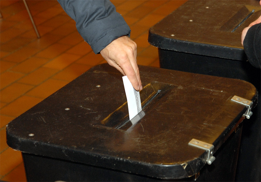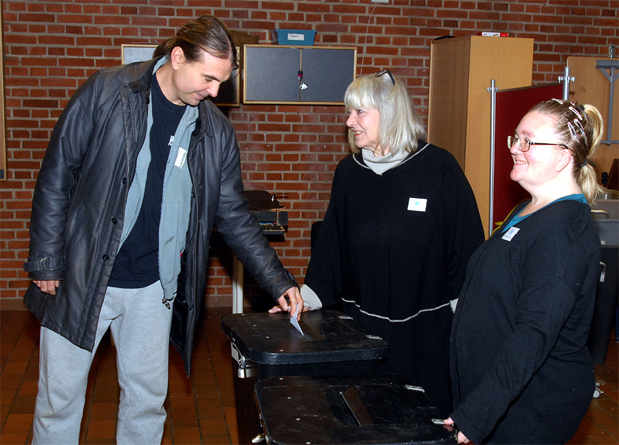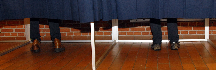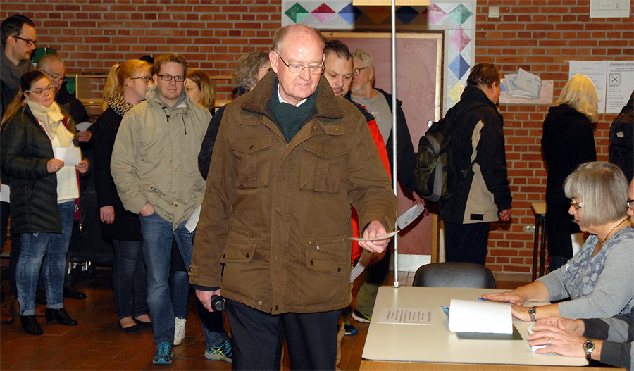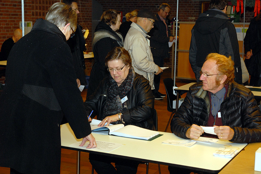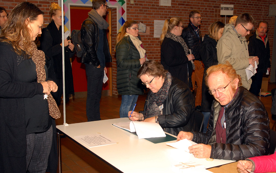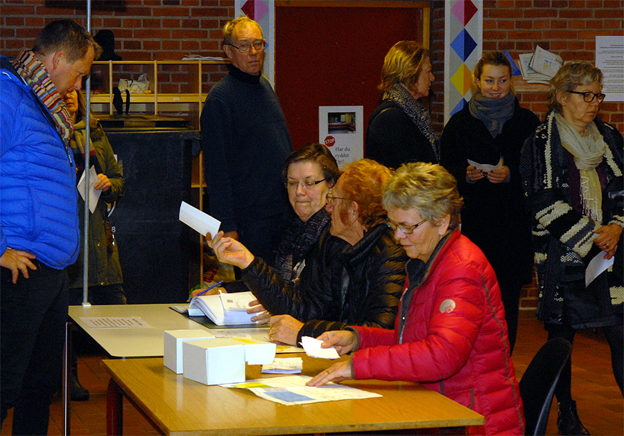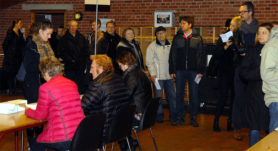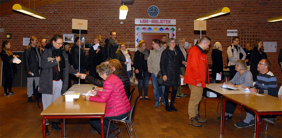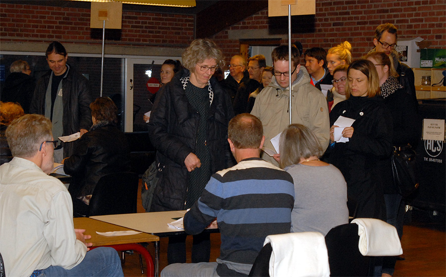 | JA/NEJ Torsdag den 3. december på slaget 9 åbnede områdechef Anette Poulsen EU-afstemningen på Mårslet Skole om det danske retsforbehold, og der var fra fra starten stor interesse i at give sin mening til kende. Valghandlingen slutter kl. 20:00. foto: ©Jørgen Lauritsen