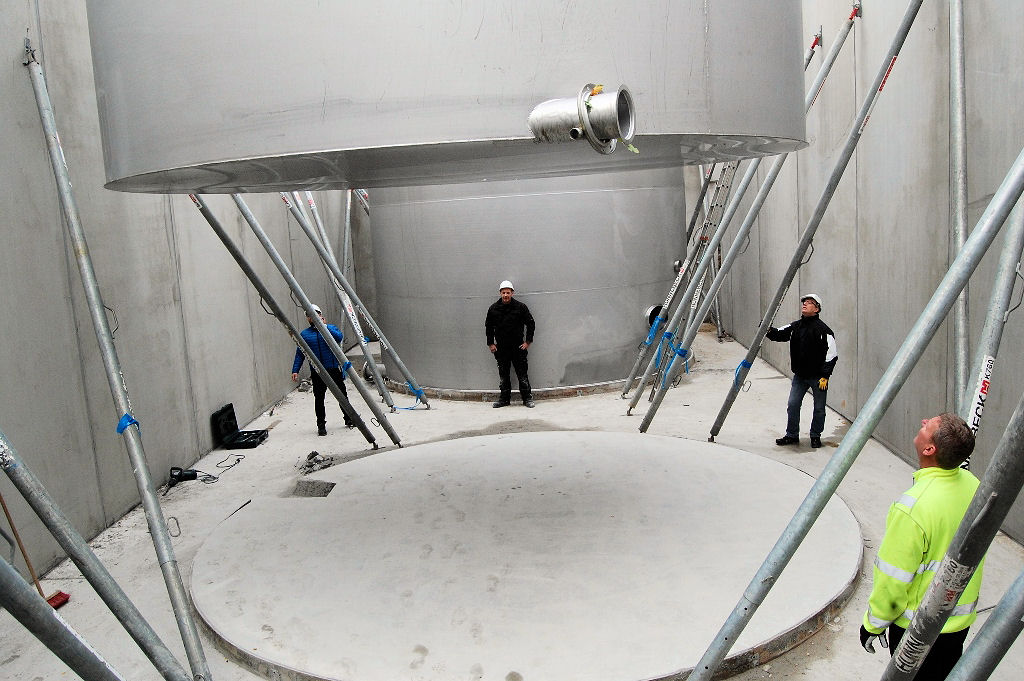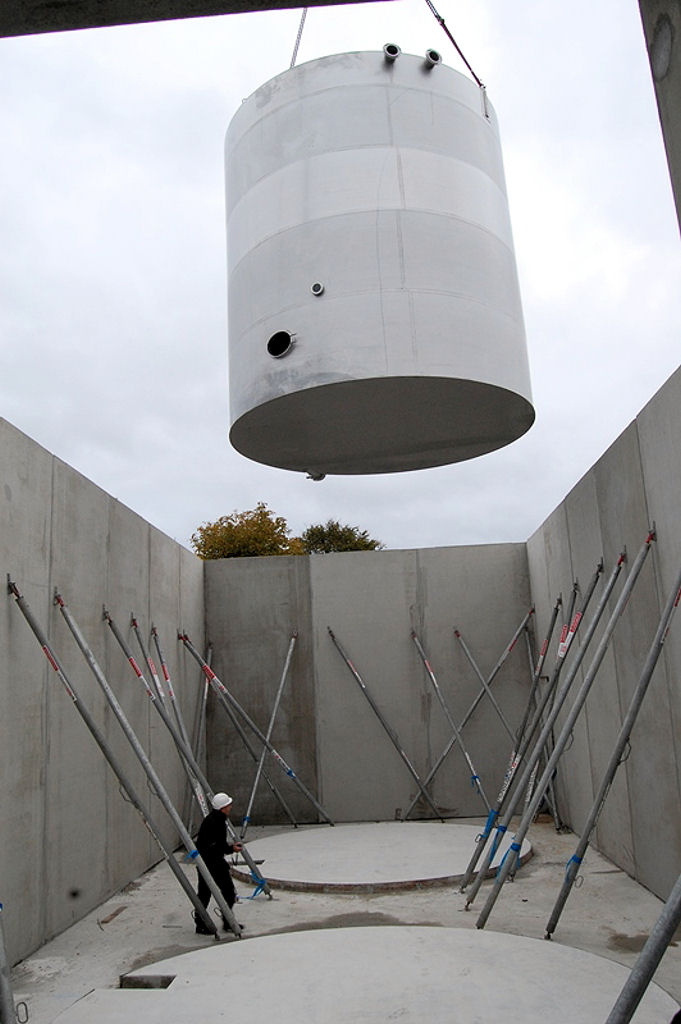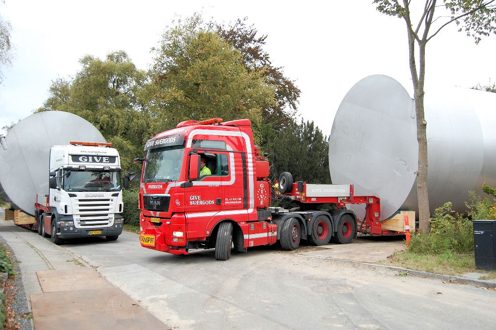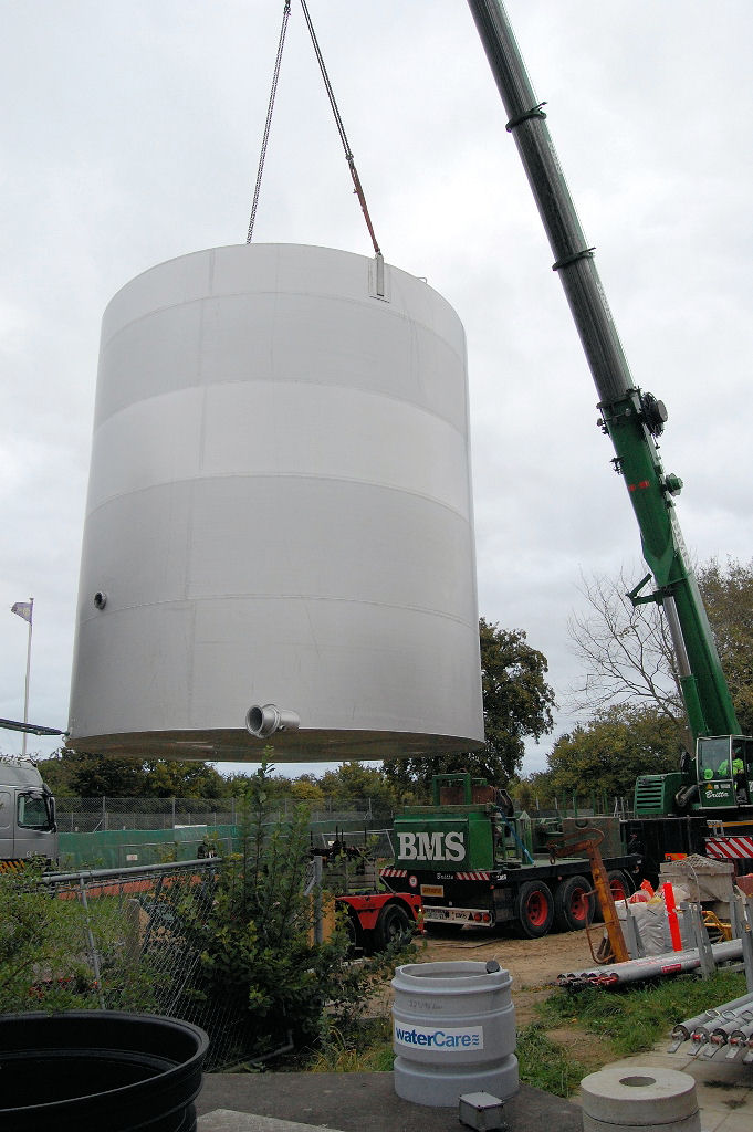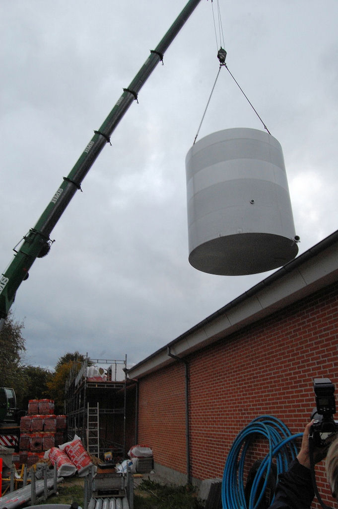 | Nye vandtanke 07/10 2016 Vandværket fik fredag morgen leveret to nye vandtanke, der hver kan rumme 150 kubikmeter. Det vil sige i alt 300.000 liter. De ni tons tunge tanke var i løbet af natten blevet kørt til Mårslet fra en fabrik i Kolding. Med millimeters præcision er de nu placeret på de dertil støbte fundamenter i vandværkets nye bygning overfor tennisbanerne på Gl. Bedervej. Senere på måneden får vandværket leveret nye filtre. Når alt det nye udstyr bliver taget i brug efter nytår, vil Mårslet Vandværk have topmoderne udstyr til at forsyne de 2100 tilknyttede husstande og virksomheder med rent vand. Det er i øvrigt også de 2100 forbrugere, der ejer vandværket. Udbygningen og moderniseringen betales med vandværkets opsparede midler, så det har ikke været nødvendigt at optage lån. /Per Henrik Hansen foto: ©Per Henrik Hansen
