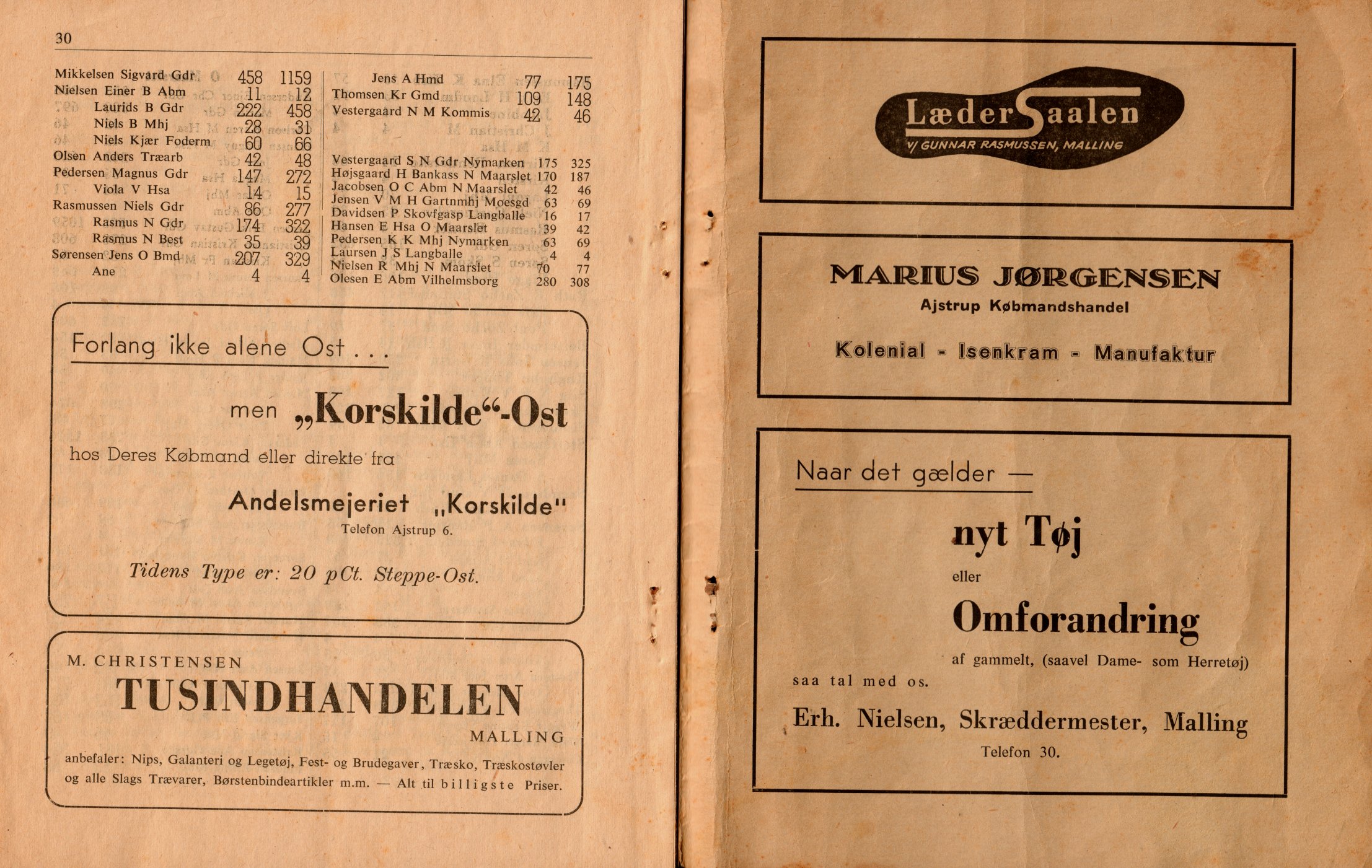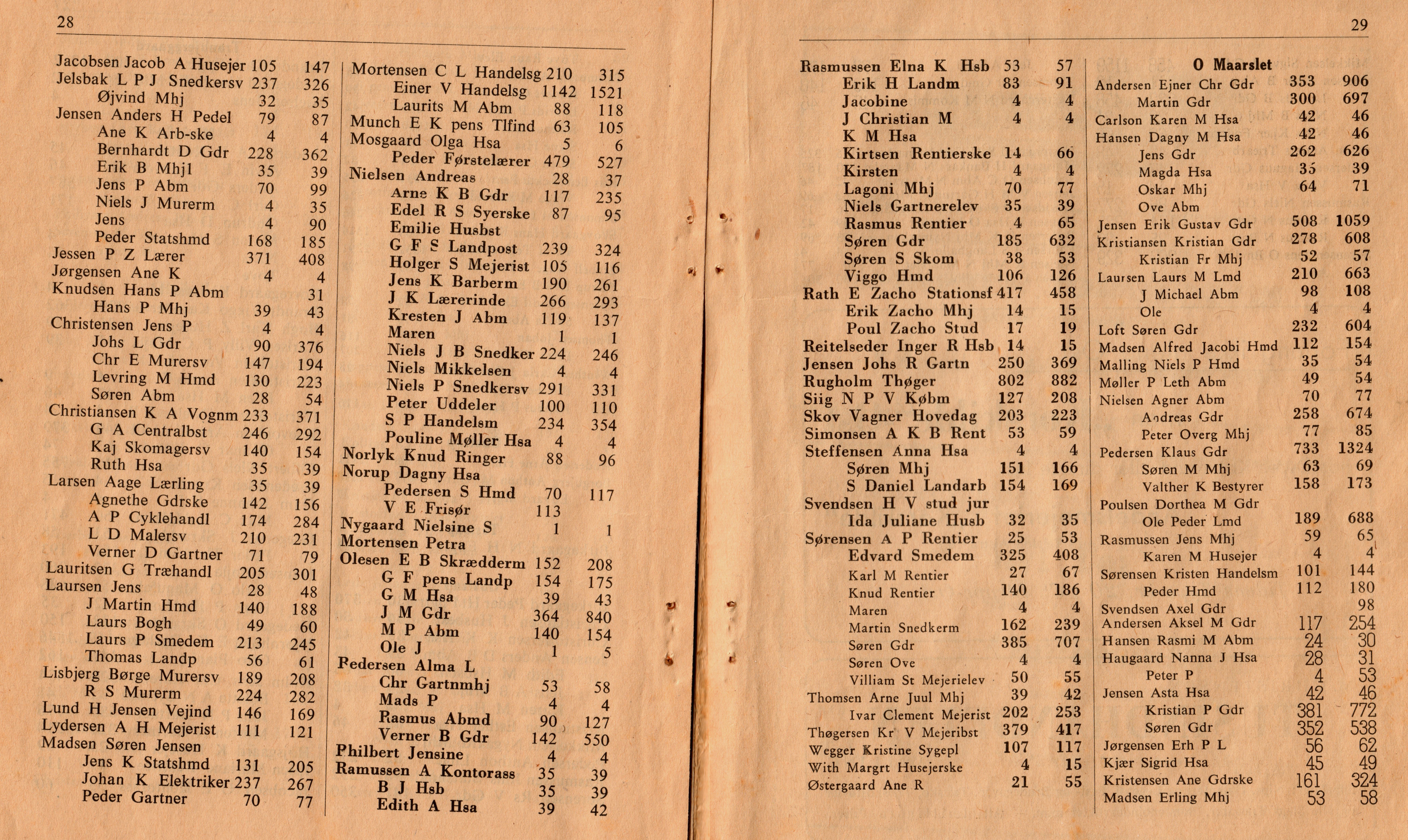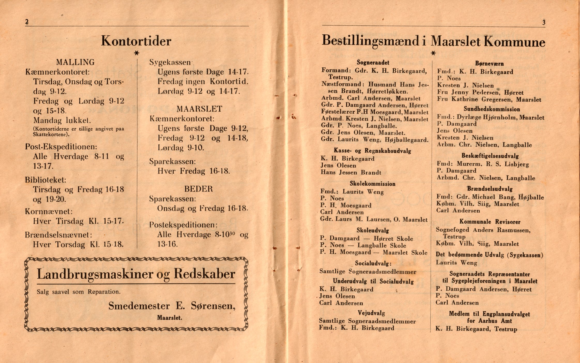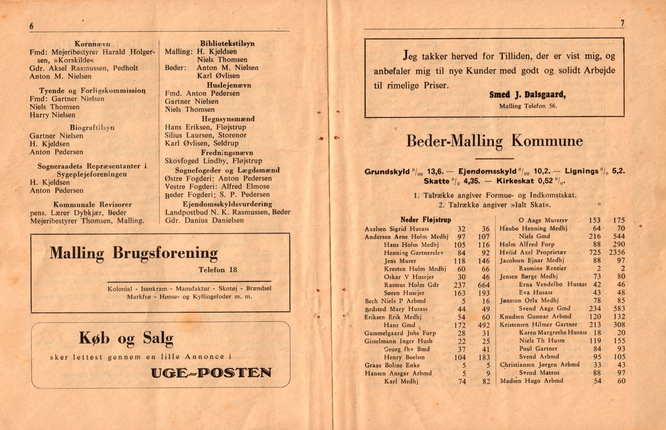 | Skattebogen er for Beder-Malling og Maarslet Kommuner Sogn og kunne købes for 1,25. kr. Bogen indeholder 30 sider og mange lokale annoncer. Bogen blev udgivet af private firmaer, og folk elskede at sidde og snage i, hvad naboen skulle af med i skat. På side 3 ses 'Bestillingsmænd i Maarslet Kommune' Sogneraad, Kasse- og Regnskabsudvalg, Skolekommission, Skoleudvalg, Socialudvalg, Vejudvalg, Børneværn, Sundhedskommission, Beskæftigelsesudvalg, Brændselsudvalg, Kommunale revisorer, Det bedømmende Udvalg (Sygekassen), Sognerådets Repræsentanter til Sygeplejeforeningen i Maarslet, Medlem af Engplansudvalget for Aarhus Amt. Skattebøgerne holdt op med at komme op i 1950rne. Årsagen er ikke kendt. På siderne 23-30 ses skattelisterne for Mårslet Kommune. Her kunne man se hvad der skulle betales i Formue- og Indkomst skat og i Ialt skat.