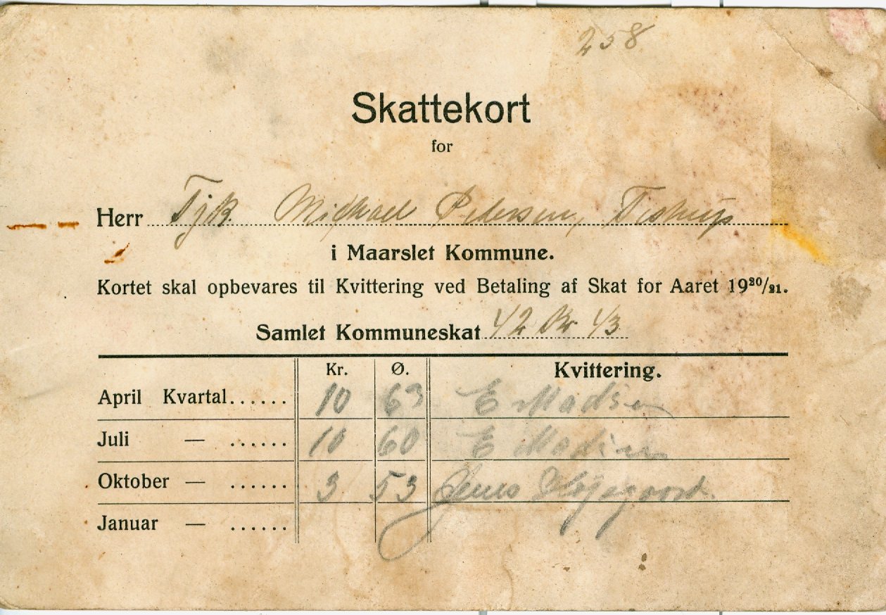 Skattekort 1920-21. Mårslet Kommune.