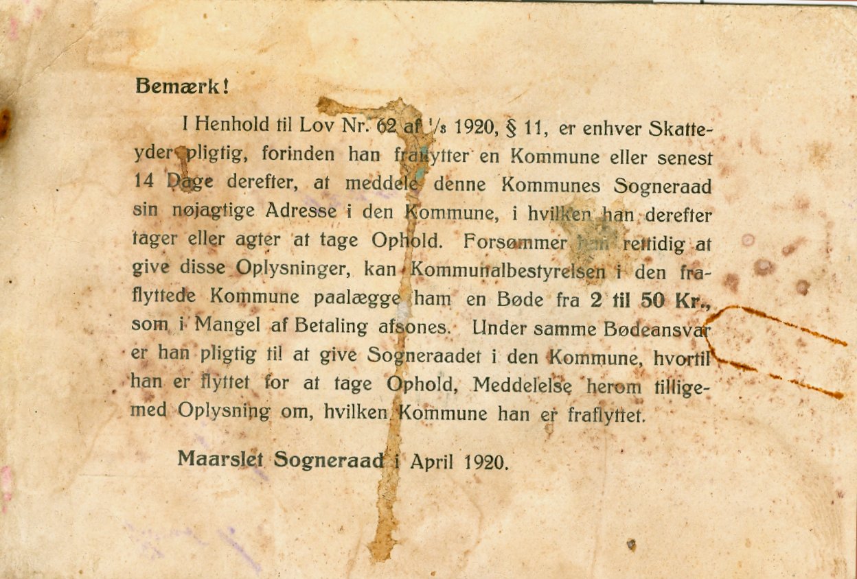 Skattekort 1920-21. MÃ¥rslet Kommune.