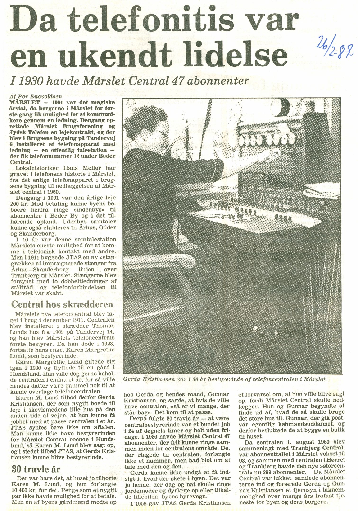 I samme bygning fandtes MÅRSLET TELEFON-CENTRAL, der blev betjent af Gerda Christiansen. Centralen eksisterede fra 1912 til 1960, da den blev underlagt Tranbjerg - indtil automatiseringen i 1966.