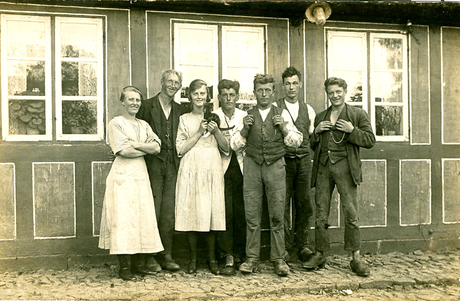 | 'Søndag 26-4-81. Hermed 1 billede af Holger Kristensen kaldet Klosterholger. Du ved nok selv hvor gammel han er. [Dette billede kan ikke ses] Og saa har jeg et Billede fra Thestrupgaardens Ungdom. Jeg synes det er saa godt, at det burde bevares i Arkivet. Det er sjældent at se saa mange (ugift) Medhjælpere paa en Gaard. Fra venstre: Ane Johansen, fra Kattrup. Jens Nielsen, Gerda ?, Ejner Enggaard fra Thestrup, var Forkarl, Otto Rasmussen (Sjellender), var anden Karl, Otto Rasmussen, (Molbo) var Svinerøjter, Gustav ?, Sønderjyde, var Fodermester. Jeg prøver at fordele de gamle Billeder; for den Dag jeg ikke er mere, er der ingen der kender dem. Med Hilsen Anne' | |